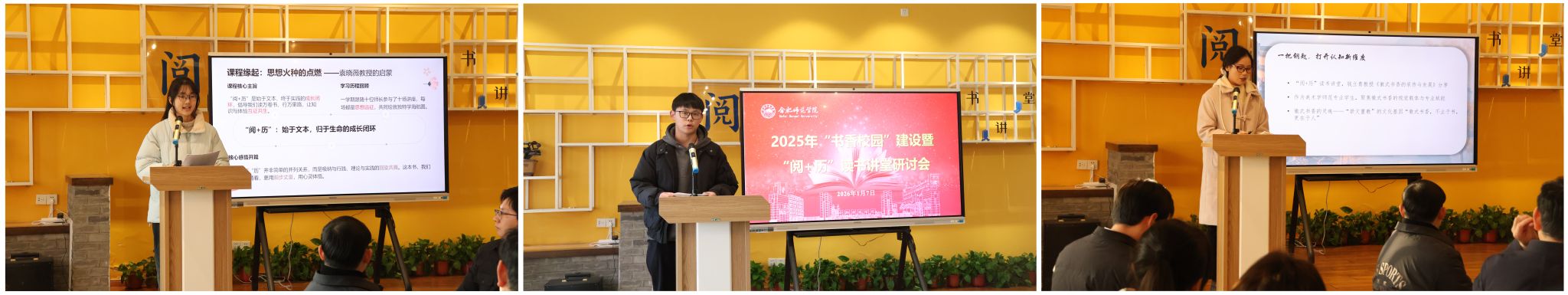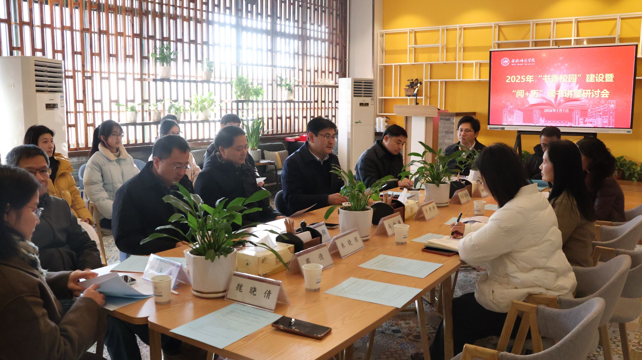 1月7日,学校举行2025年度“书香校园”建设暨“阅+历”读书讲堂研讨会,宣传部、教务处、团委、学生处、图书馆等部门负责人,“阅+历”读书讲堂授课教师代表,阅读推广人代表,学生代表,相关社团代表参加研讨会。研讨会由教务处处长、安徽十佳阅读推广人钱立青主持。