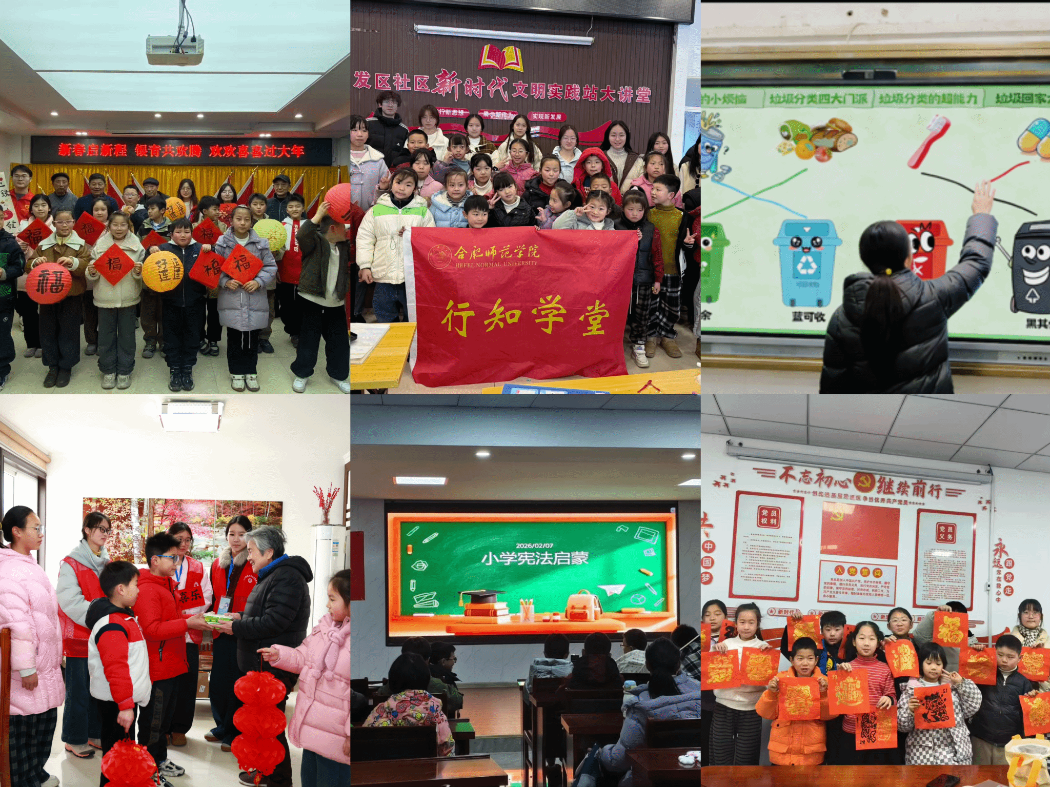 经济与管理学院、音乐学院通过与六安团市委合作,依托社区党群服务中心、新时代文明实践站等阵地,精准聚焦快递员、外卖骑手、网约车司机等新就业群体家庭假期“看护难、辅导难”问题,组织返乡大学生志愿者担任“小先生”,在金安区正阳社区、裕安区河滨社区开办“行知学堂”,用公益托管与暖心陪伴,切实为新就业群体家庭解除后顾之忧,让孩子们度过安全、充实、有意义的假期。外国语学院合肥市航空新城行知学堂的“小先生”们为每位孩子准备了雕刻精美的“福”字木版、红纸、墨汁和拓包。孩子们在志愿者的指导下,小心翼翼地用拓包蘸取墨汁,在木板上均匀拍打,然后将红纸轻轻覆盖,用棕刷细细刷平,最后缓缓揭起——一个鲜亮饱满的“福”字便跃然纸上,这场小型“福”字展览,吸引了众多社区居民驻足观赏。教育与心理科学学院绩溪“行知学堂”开展“小学宪法启蒙”主题课,“小先生”化身普法小讲师,通过趣味案例和互动问答,让抽象的法律条文变得鲜活可感。孩子们认真聆听、积极思考,这场宪法启蒙课让法治精神浸润童心,也让行知精神在普法实践中薪火相传。教育与心理科学学院宿州埇桥行知学堂联合拂晓报社开展红色研学活动,“小先生”们带领小学员走进拂晓报史馆,聆听《拂晓报》在烽火中诞生、在奋斗中成长的红色故事,沉浸式学习革命先辈勇敢进取、不畏艰难的精神。此次活动不仅让红色文化浸润童心,更让孩子们在实践中传承希望与奋进的拂晓精神,坚定理想信念,收获成长力量。物理与材料工程学院合肥市临湖社区行知学堂聚焦青少年网络安全、人身安全与心理健康等重点领域,以贴近儿童认知特点的方式,深入浅出地开展安全教育。授课志愿者依托团中央发布的《AI科学使用手册》,结合真实案例,生动讲解人工智能工具的合理使用边界,警示网络沉迷与诈骗风险,并传授识别网络谣言、应对网络欺凌的有效方法。除网络安全外,课程还系统重温了交通出行、防火用电等基础安全常识,特别强调合肥市全域禁止燃放烟花爆竹的相关规定,并提醒养成及时拔除充电设备等良好生活习惯。化学与制药工程学院安庆市塔畈乡行知学堂依托化学与制药工程学院专业优势,学堂精心打造趣味化学科普课堂,将专业知识转化为简单易懂、安全有趣的小实验与小科普,让孩子们在动手实践中感受科学奥秘,激发探索兴趣与科学思维。此外,面向社区老年群体开设“银发学堂”特色服务。结合老年人实际需求,开展智能手机使用教学、健康知识科普、反诈宣传、文娱互动等暖心活动,耐心讲解手机操作、网络安全、日常保健等实用内容,帮助老年人跨越“数字鸿沟”,提升生活幸福感与安全感。活动以陪伴式、互动式服务为主,氛围温馨融洽,得到老人们的一致认可与好评。马克思主义学院阜阳市临泉县行知学堂走进城东街道文王社区和县图书馆,采取课堂授课与“走家串户”相结合的方式开展服务。“小先生”们不仅在课堂上带领孩子学习知识,更深入学生家庭了解成长环境,凝聚育人合力,用脚步诠释“爱满天下”的教育情怀。活动期间,学堂创新“思政+N”授课模式,围绕思想引领开设课程,并走进社区书屋陪伴阅读,让孩子收获知识与温暖。此次活动,既丰富了少年学子的假期生活,也让大学生在实践中淬炼教育初心,以青春担当传递行知薪火。