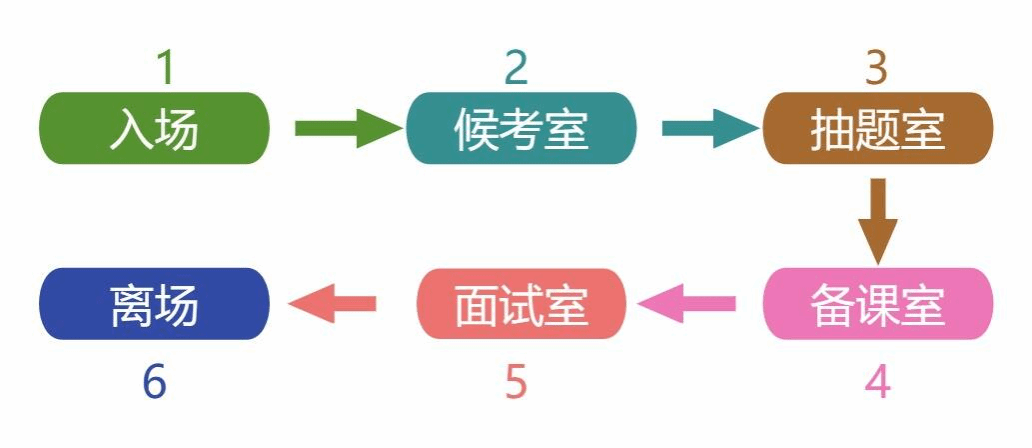 (五)离场:面试结束后,考生向考官提交抽取的面试试题及备课纸,在得到考官许可后离开面试考场,前往候考室领取手机等禁带物品及时离开考点。