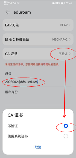 beat365官网师生在联盟高校或机构访问时,搜索到eduroam无线环境后,通过wifi连接认证后即可访问互联网,上网账号为:学号或工号@hfnu.edu.cn,密码为:校园网认证密码(请妥善保管,切勿外传)。如下图设置: