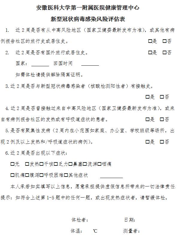 3.请所有体检人员前往安医大一附院绩溪路院区体检中心前,可用支付宝或皖事通扫描安医体检安康码;若无法扫描安康码,请自行下载打印安徽医科大学第一附属医院健康管理中心新型冠状病毒感染风险评估表并填写完整。体检时主动出示安康码或风险评估表,否则体检中心不予接待体检(安医体检安康码及风险评估表见附件)。