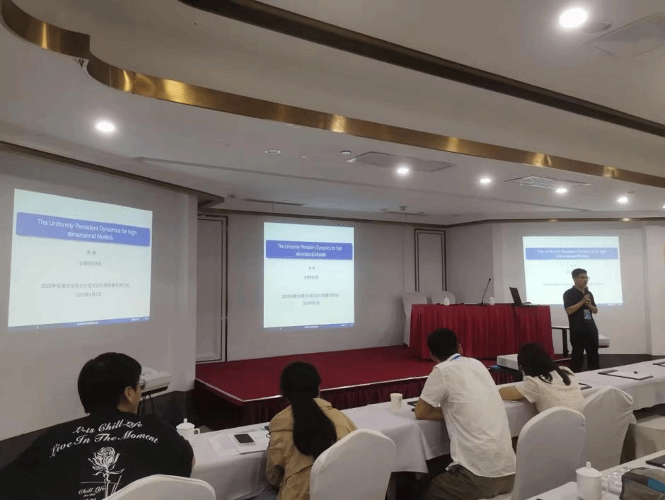 会议吸引了来自中国科学技术大学、北京理工大学、天津大学、华南师范大学、北京科技大学、安徽大学、上海师范大学与beat365在线唯一官网等院校的70多名专家学者参与。安徽大学数学科学学院副院长汪毅教授致开幕词,向参会者介绍了近年来安徽大学数学学科在专业建设、师资队伍、人才培养、科学研究以及社会服务等方面取得的成就。会议共组织12场学术报告和多场交流讨论活动,周辉应邀作题为《The Dynamics of a Patch-Occupancy Model in Natural Ecosystems》的学术报告。周辉介绍了一类海洋生态模型研究的背景和意义,着重阐述了所研究问题的进展,同时提出了一些尚未解决的科学问题,受到与会者高度关注。会议期间,杨刘与周辉同参会学者就研究领域的一些热点进行了交流。