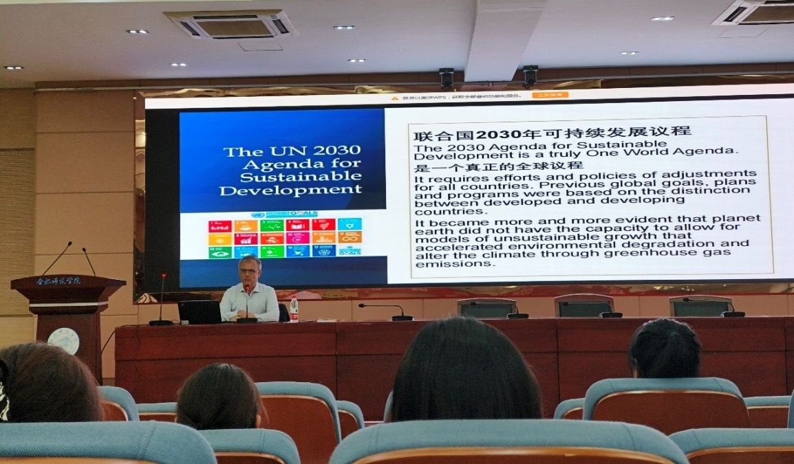 本网讯 为拓展国际视野,增进国际交流,9月20日下午,德国柏林自由大学可持续发展专家Berthold Kuhn应邀为beat365官网师生作“国际合作语境下的可持续发展”的专题讲座。讲座于beat365在线唯一官网锦绣校区学术报告厅举行,科研处处长胡昂、国际交流与合作处副处长蒋道华出席,讲座由外国语学院研究生部主任强云老师主持,学校相关院系师生参加了本次讲座。