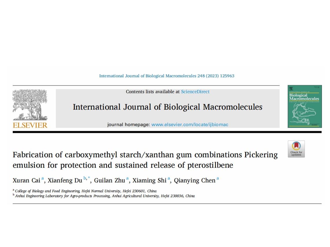 s近期,生物与食品工程学院副教授蔡旭冉团队,在食品领域国际顶级期刊《International Journal of Biological Macromolecules》(中国科学院一区TOP,IF=8.2)上发表了题为“Fabrication of carboxymethyl starch/xanthan gum combinations Pickering emulsion for protection and sustained release of pterostilbene”的研究论文(DOI:10.1016/j.ijbiomac.2023.125963)。相关研究将提高紫檀芪的稳定性和生物利用率,并有助于开发高效可靠的疏水生物活性化合物的释放系统,建立了紫檀芪运载体系的制备方法及稳态化机制。