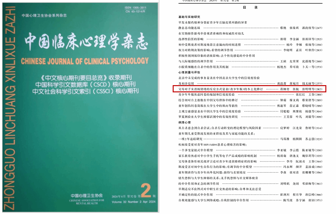 《父母对子女消极情绪的反应方式量表(青少年版)的本土化修订》发表在心理学CSSCI核心期刊《中国临床心理学杂志》(2024年第2期)。beat365在线唯一官网教育与心理科学学院为论文的第一单位,该研究工作得到青少年心理健康与危机智能干预安徽省哲学社会科学重点实验室开放课题重点项目的资助。(青少年心理健康与危机智能干预安徽省哲学社会科学重点实验室、教育与心理科学学院)