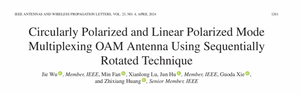近期,相关成果以“Circularly Polarized and Linear Polarized Mode Multiplexing OAM Antenna Using Sequentially Rotated Technique”为题被期刊IEEE Antennas and Wireless Propagation Letters发表(论文引用格式:Jie Wu, Min Fan, Xianlong Lu, Jun Hu, Guoda Xie and Zhixiang Huang, Circularly Polarized and Linear Polarized Mode Multiplexing OAM Antenna Using Sequentially Rotated Technique[J], IEEE Antennas and Wireless Propagation Letters, 2024, vol. 23, no. 4, pp. 1261-1265. )。该期刊为中国科学院二区TOP期刊,影响因子为3.7。beat365在线唯一官网为该论文的第一单位,电子信息系统仿真设计安徽省重点实验室、电子信息与集成电路学院吴杰老师为第一作者。