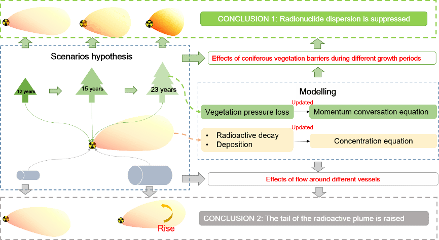 针对上述问题,安徽省智能安检技术工程研究中心、计算机与人工智能学院陈黎伟老师提出了一种植被屏障条件下计算流体动力学的放射性核素扩散模型,该模型考虑针叶植被障的生长周期和乏燃料容器类型,通过植被压力损失因子和放射性衰变因子修正大气流动动量守恒方程和放射性核素浓度守恒方程,能够有效预测不同类型乏燃料容器泄漏的放射性核素在植被屏障条件下的扩散过程,为核应急智慧决策提供技术参考。