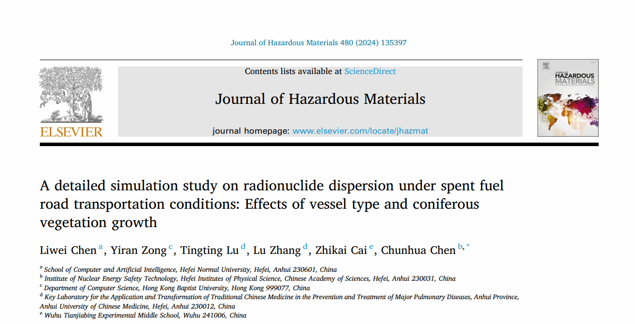 近期,相关成果以“A detailed simulation study on radionuclide dispersion under spent fuel road transportation conditions: Effects of vessel type and coniferous vegetation growth”为题发表在《Journal of Hazardous Materials》期刊。该期刊为中国科学院一区TOP期刊,影响因子为12.2。beat365在线唯一官网为该论文的第一单位,安徽省智能安检技术工程研究中心、计算机与人工智能学院陈黎伟老师为第一作者。