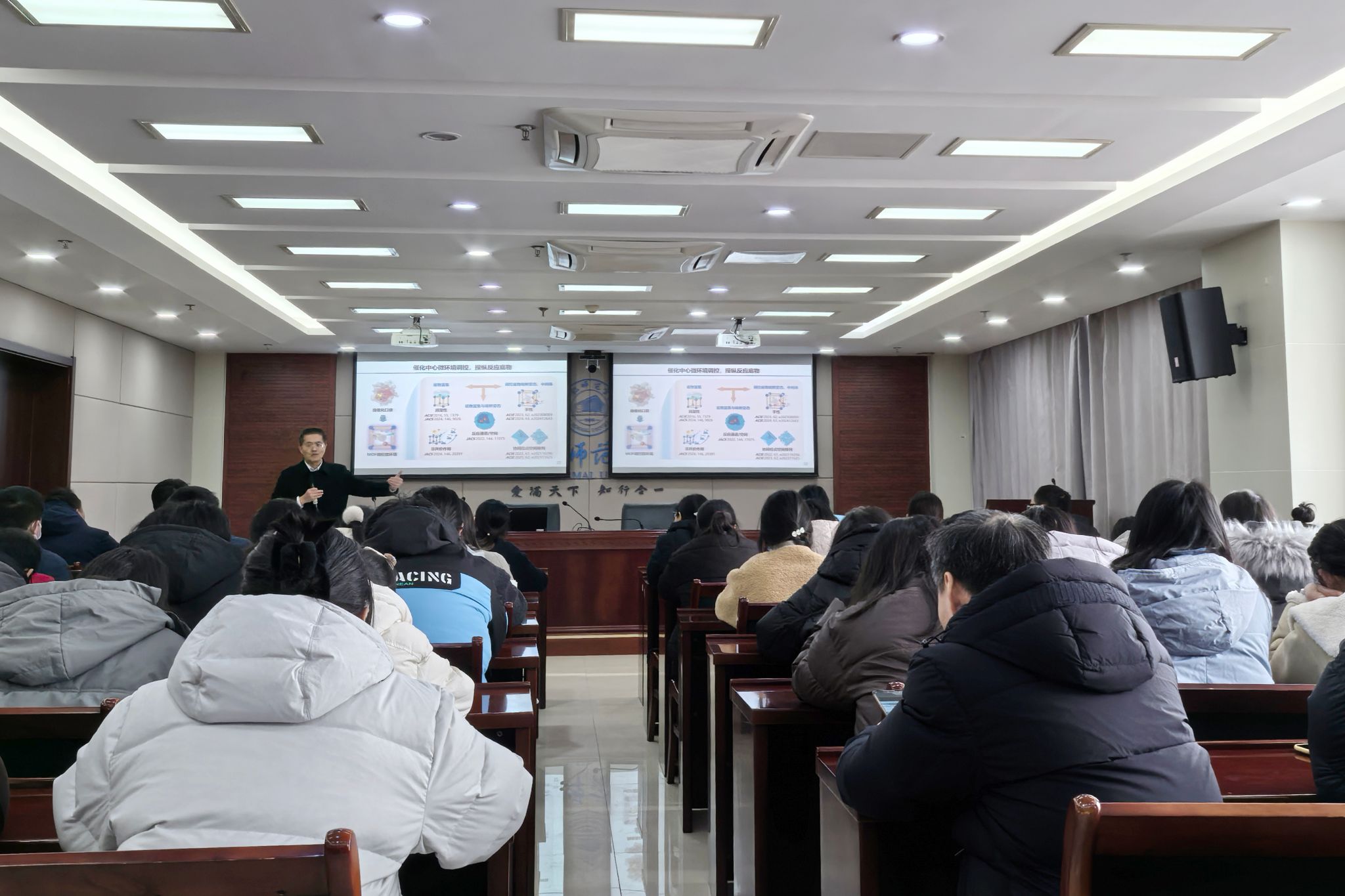 江海龙在学院2011会议室作了题为“催化中心微环境的化学调控”的学术报告,吸引了众多对化学、材料科学等领域感兴趣的师生前来聆听。报告由科研处相关负责人主持。