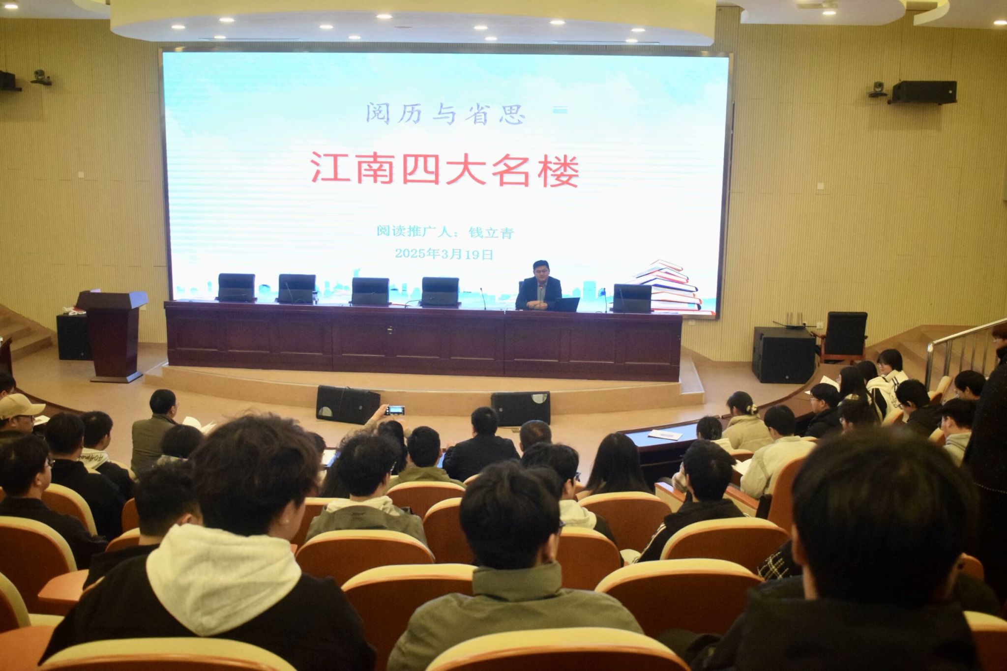 3月19日,“阅+历”读书讲堂“名家导读”系列讲座在滨湖校区多功能报告厅举办,江淮文化名家、安徽省十佳阅读推广人,教务处处长钱立青教授为同学们作了题为“阅历与省思:江南四大名楼”的讲座。计算机与人工智能学院学生代表150余人参加。滨湖校区综合管理办公室主任周荣,图书馆馆长方孝玲,美术与设计学院副院长吴道义,计算机与人工智能学院党委副书记杨萍出席。讲座由计算机与人工智能学院党委书记王祥主持。