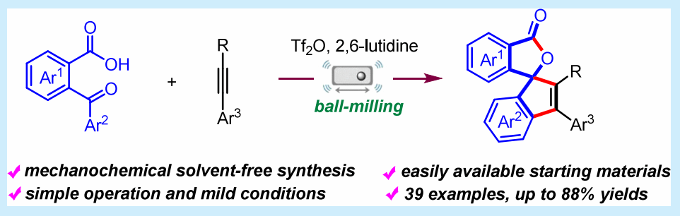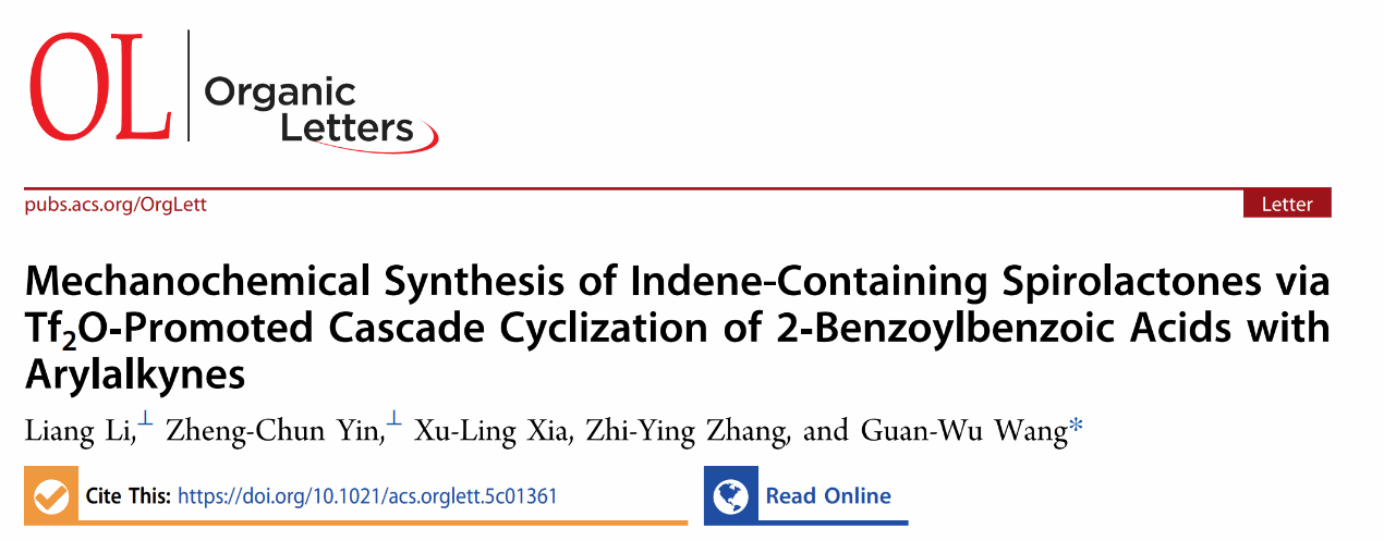 近期相关成果以“Mechanochemical Synthesis of Indene-Containing Spirolactones via Tf2O‑Promoted Cascade Cyclization of 2‑Benzoylbenzoic Acids with Arylalkynes”为题发表在《Organic Letter》期刊上,该期刊为中国科学院SCI一区TOP期刊,影响因子为4.9。beat365在线唯一官网为第一单位,化学与制药工程学院李亮老师为第一作者。