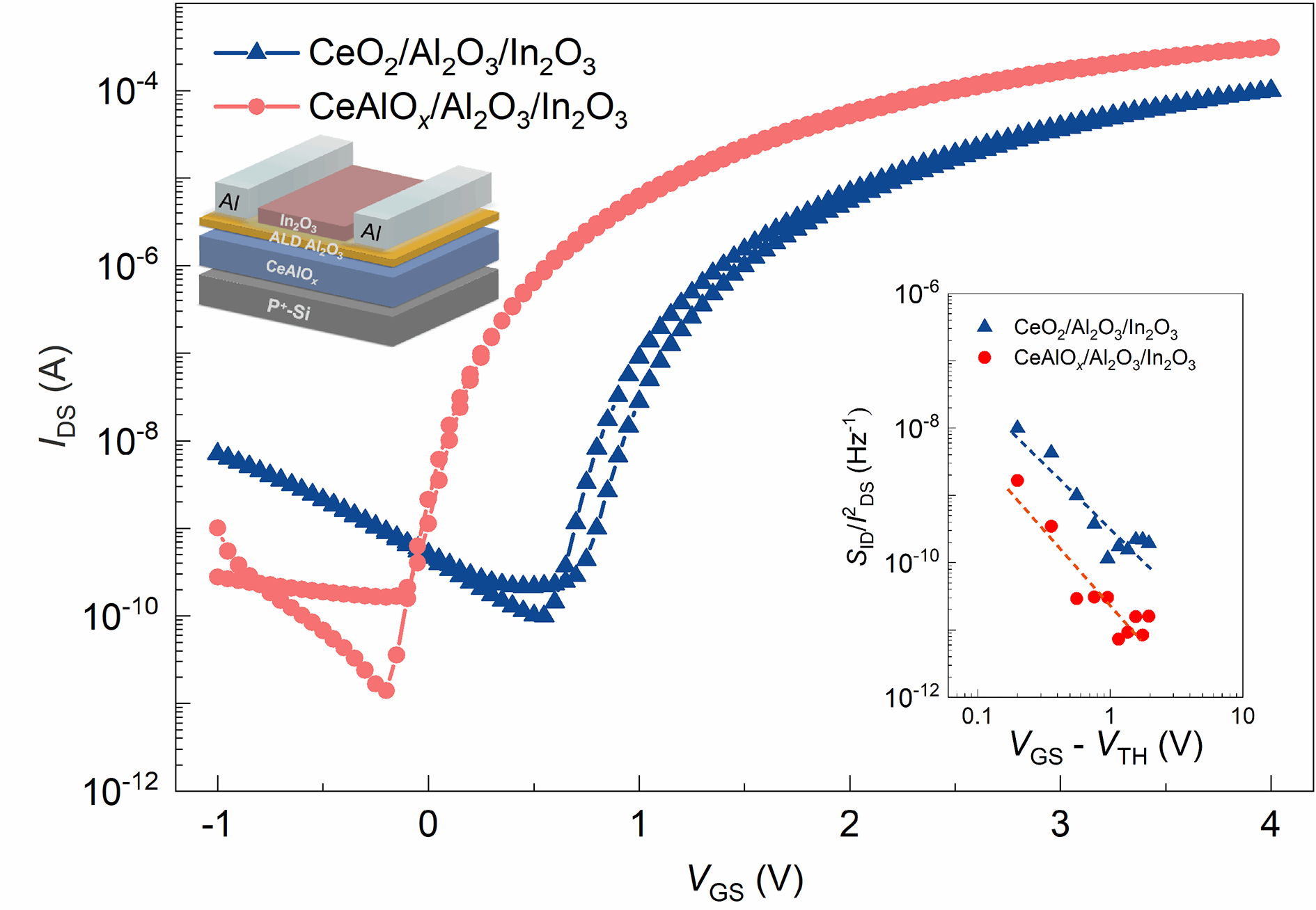 我院电子信息与集成电路学院王雷妮成功开发出一种基于CeAlOx/Al₂O₃叠层栅介质结构的新型In₂O₃薄膜晶体管(TFT),在低电压操作下实现了优异的电学性能与稳定性。该器件在2 V低电压下工作,表现出理想的n型特性,其关态电流低至7.97×10⁻¹² A。通过优化Al:Ce原子比为3:7,器件多项关键参数达到先进水平:饱和迁移率高达26.86 cm²·V⁻¹·s⁻¹,开关比达3.58×10⁷,亚阈值摆幅低至0.08 V/decade,界面态密度仅为1.39×10¹² cm⁻²。在稳定性方面,器件在正偏压应力下阈值电压仅偏移0.06 V,负偏压应力下偏移-0.04 V,展现出卓越的工作可靠性。低频噪声分析进一步证实,Al掺杂有效降低了栅介质缺陷与界面态密度。基于该TFT构筑的电阻负载反相器表现出色,电压增益达15.1,噪声容限比高达59.8%,并具备快速电压切换能力,展现出在先进逻辑电路中的应用潜力。这项研究为开发高性能、低功耗氧化物薄膜晶体管提供了新的技术路径。
