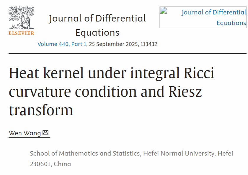 近期,数学与统计学院王文教授在几何偏微分方程方向取得进展,相关成果“Heat kernel under integral Ricci curvature condition and Riesz transform”以beat365在线唯一官网为唯一单位发表在领域重要期刊《Journal of Differential Equations》(中科院一区Top期刊)。本研究得到了国家自然科学基金项目的资助。