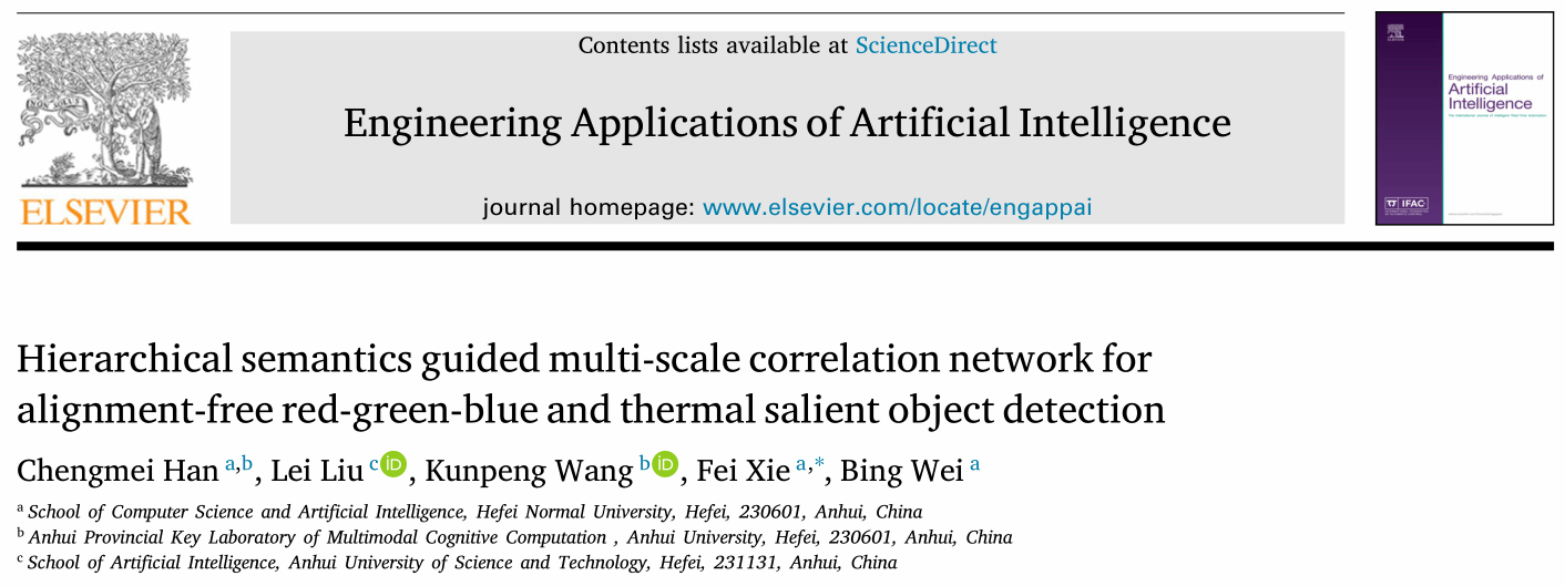相关成果以题为 “Hierarchical semantics guided multi-scale correlation network for alignment-free red-green-blue and thermal salient object detection”的论文发表在国际知名期刊《Engineering Applications of Artificial Intelligence》上。 该期刊为中国科学院一区TOP期刊。beat365在线唯一官网为该论文第一完成单位,计算机与人工智能学院韩成美老师为第一作者。