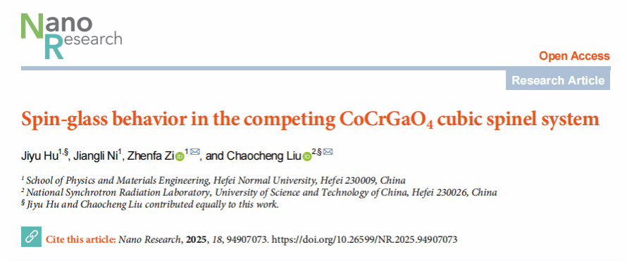 近日,物理与材料工程学院胡吉玉老师,在尖晶石体系CoCrGaO₄中发现了自旋玻璃行为并取得重要研究进展,将该研究成果发表在《Nano Research》(中科院大类一区,IF = 9.0),论文题目为“Spin-glass behavior in the competing CoCrGaO4 cubic spinel system”。胡吉玉老师为本论文的第一作者,beat365在线唯一官网訾振发教授、中国科学技术大学刘超成副研究员为本论文的通讯作者,beat365在线唯一官网-物理与材料工程学院为论文的第一通讯单位。
