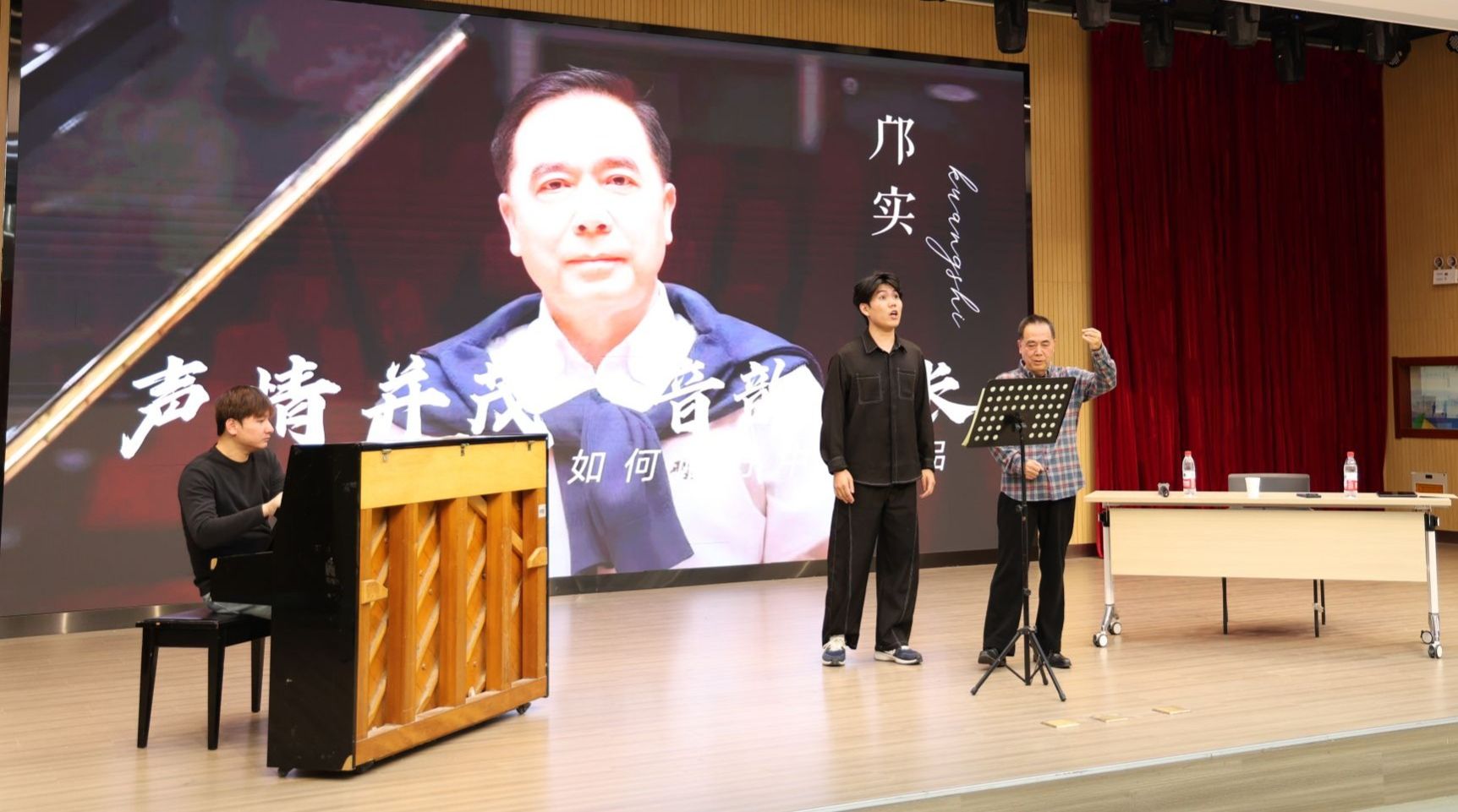 讲座伊始,邝实以其深厚的艺术积淀和生动的表达风格,从中国声乐作品的文化内涵、风格特点切入,系统阐述了“唱好中国作品”的核心要义。他结合自身作为安徽省文联文艺志愿者协会主席、中国音乐家协会会员、安徽省音乐家协会声乐专业委员会主任的丰富阅历,强调中国声乐作品承载着独特的民族情感与文化基因,演唱者需从历史背景、人文意蕴等维度深入挖掘作品内核,才能实现“声”与“情”的融合。