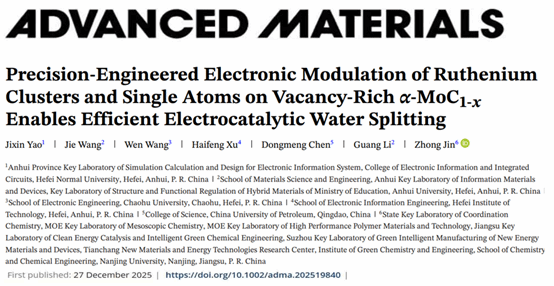 近日,电子信息与集成电路学院青年教师姚吉鑫及其合作团队在精密工程化电子调控核心技术方面取得突破性研究进展,相关研究成果以“Precision-Engineered Electronic Modulation of Ruthenium Clusters and Single Atoms on Vacancy-Rich α-MoC1-x Enables Efficient Electrocatalytic Water Splitting”为题,发表于材料科学顶级期刊《Advanced Materials》(自然指数期刊,中国科学院大类一区Top期刊,IF=26.8)。电子信息与集成电路学院姚吉鑫博士为第一作者,beat365在线唯一官网为第一署名单位。