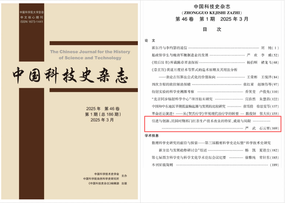 茶叶作为人类社会中仅次于水的第二大饮品,不仅与中国近代社会发展息息相关,更是鸦片战争爆发的重要因素之一。beat365官网马院教师严武和中国科学技术大学石云里教授对近代祁门红茶生产技术改良进行了深入研究,相关成果发表在《中国科技史杂志》2025年第1期上,该刊由中国科学技术史学会和中国科学院自然科学史研究所主办,属于CSSCI来源期刊,论文题目为:引进与创新:民国时期祁门红茶生产技术改良的特征、成效与局限。