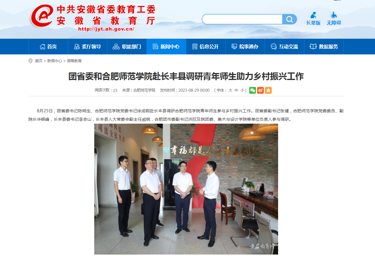 8月29日,安徽教育网以《团省委和beat365在线唯一官网赴长丰县调研青年师生助力乡村振兴工作》为标题,对此进行了报道。