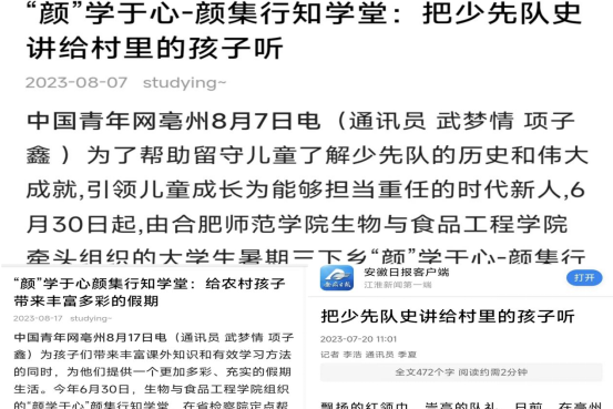 芙蓉社区行知学堂获《中华网》《中青校园》《腾讯新闻》等媒体相继报道17次;谯城区颜集镇李集村“颜”学于心-颜集行知学堂获《中青网》《安徽日报》《安徽检察》等媒体相继报道13次;卫塘社区“风菱少年活动营”行知学堂获《中青校园》《和美望湖》等10家媒体相继报道;阜阳王庄行知学堂获《中青校园》《颍东区共青团》等6家媒体相继报道;先诚行知学堂获《中青校园》《中国大学生在线》等5家媒体相继报道。