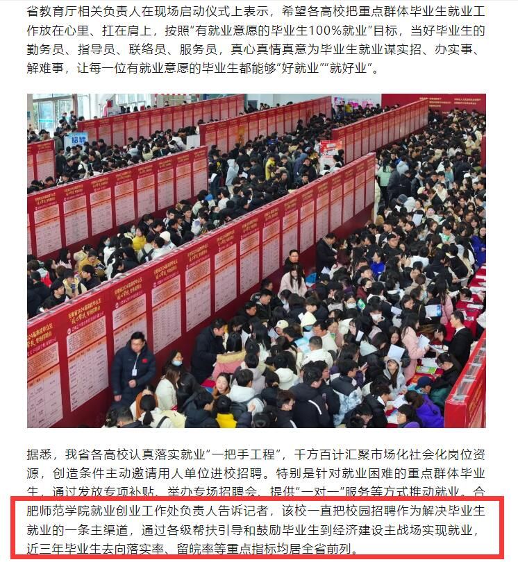 2月28日,安徽日报以《正式开启!4000余名毕业生进场应聘》对我院举办“人才兴皖‘就’在江淮”省级高校毕业生系列招聘活动之“暖心帮扶”专场招聘会进行报道。