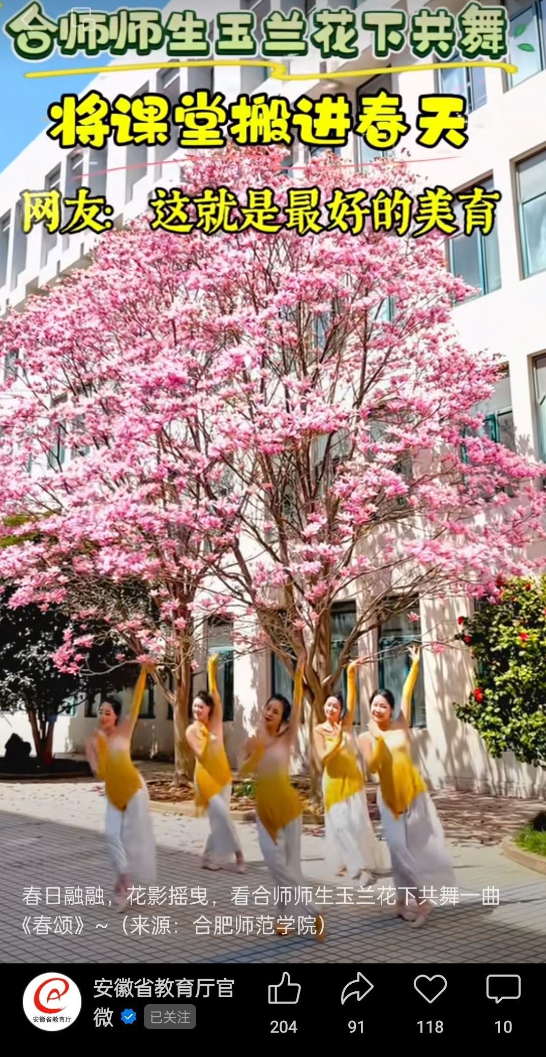 3月26日,安徽省教育厅官微视频号发布我院师生玉兰花下共舞视频。(宣传部)