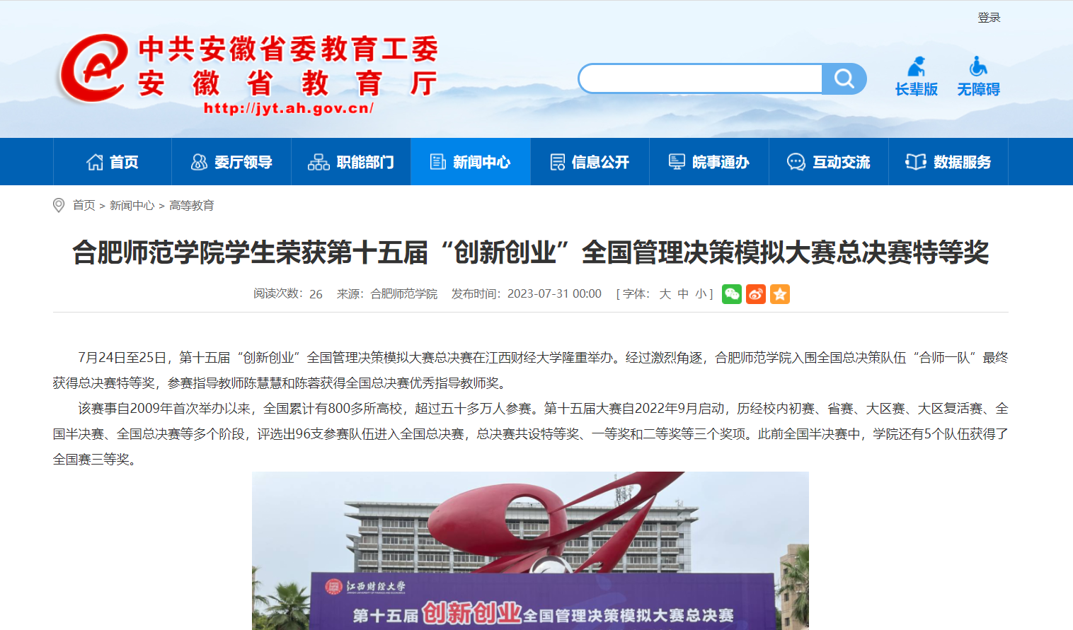 7月31日,安徽教育网首页以《beat365在线唯一官网学生荣获第十五届“创新创业”全国管理决策模拟大赛总决赛特等奖》为标题,对此进行了报道。