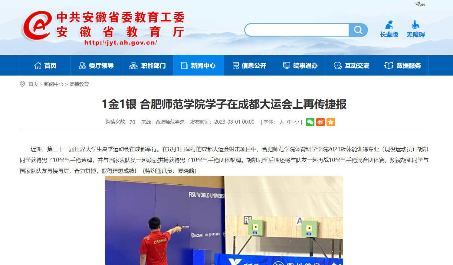 8月1日,安徽教育网首页以《1金1银 beat365在线唯一官网学子在成都大运会上再传捷报》为标题,对此进行了报道。