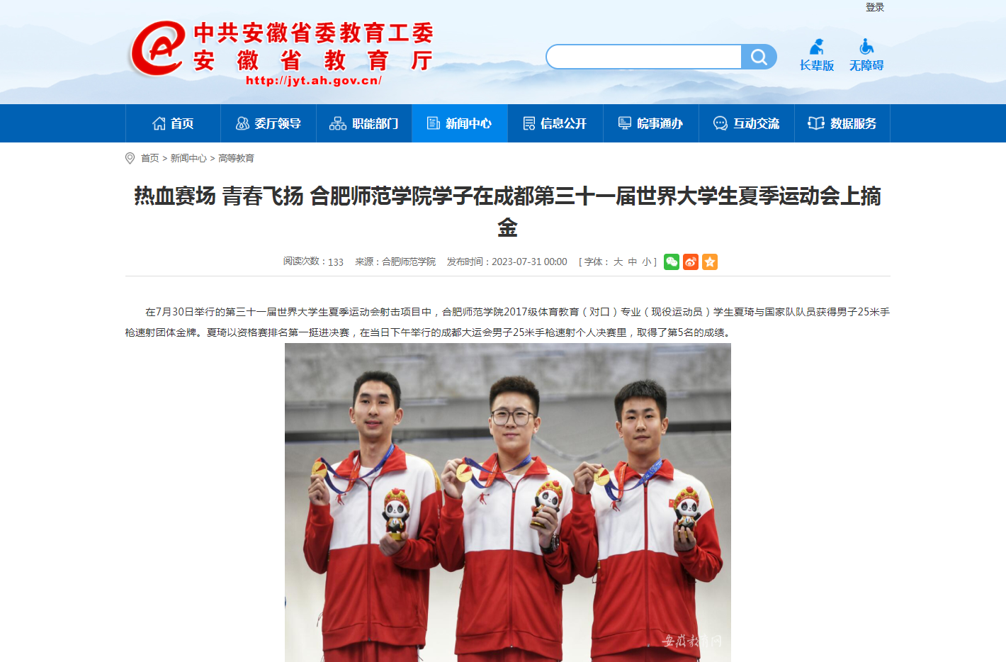 7月31日,安徽教育网首页以《热血赛场 青春飞扬 beat365在线唯一官网学子在成都第三十一届世界大学生夏季运动会上摘金》为标题,对此进行了报道。