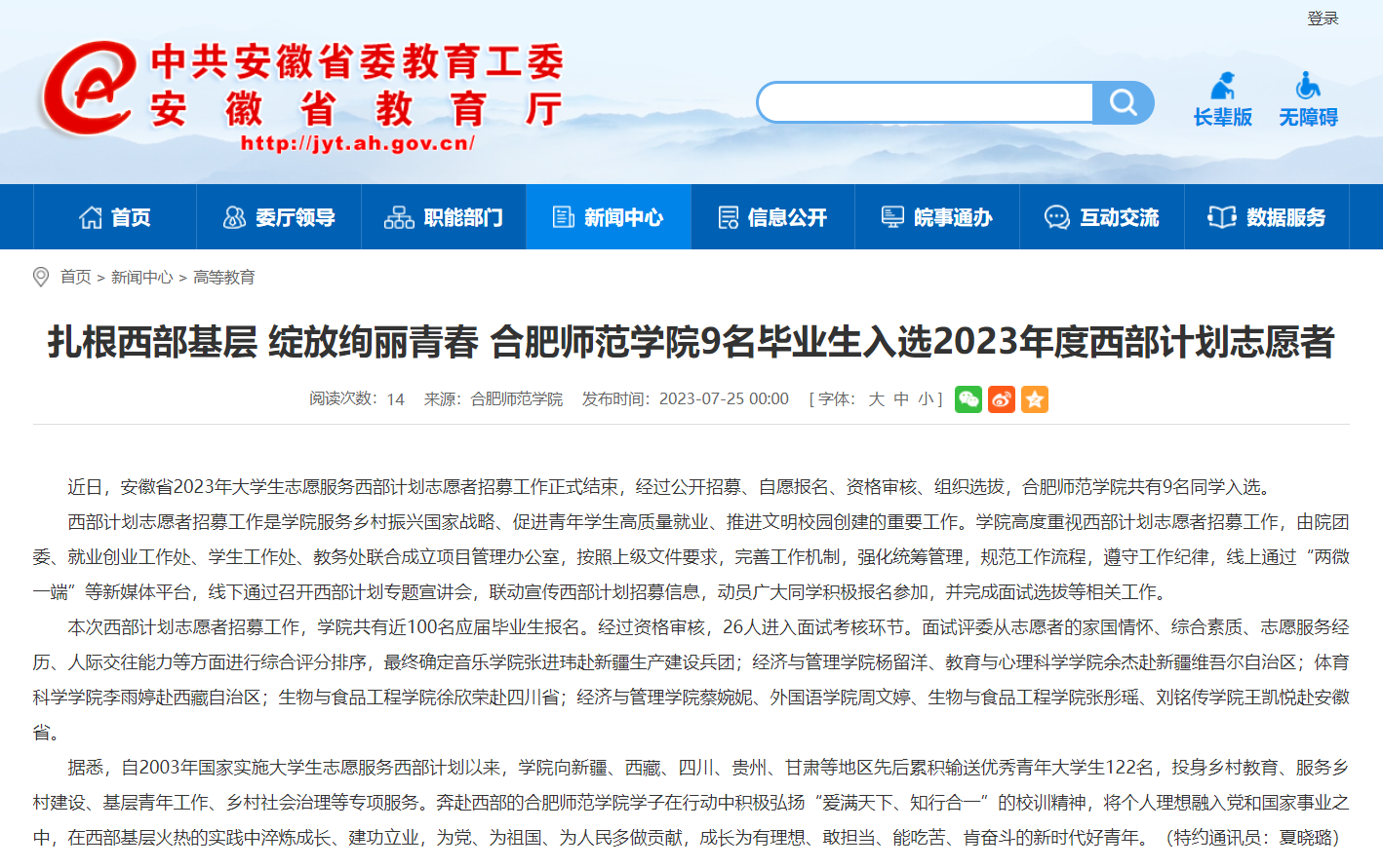 7月25日,安徽教育网首页以《扎根西部基层 绽放绚丽青春 beat365在线唯一官网9名毕业生入选2023年度西部计划志愿者》为标题,对此进行了报道。