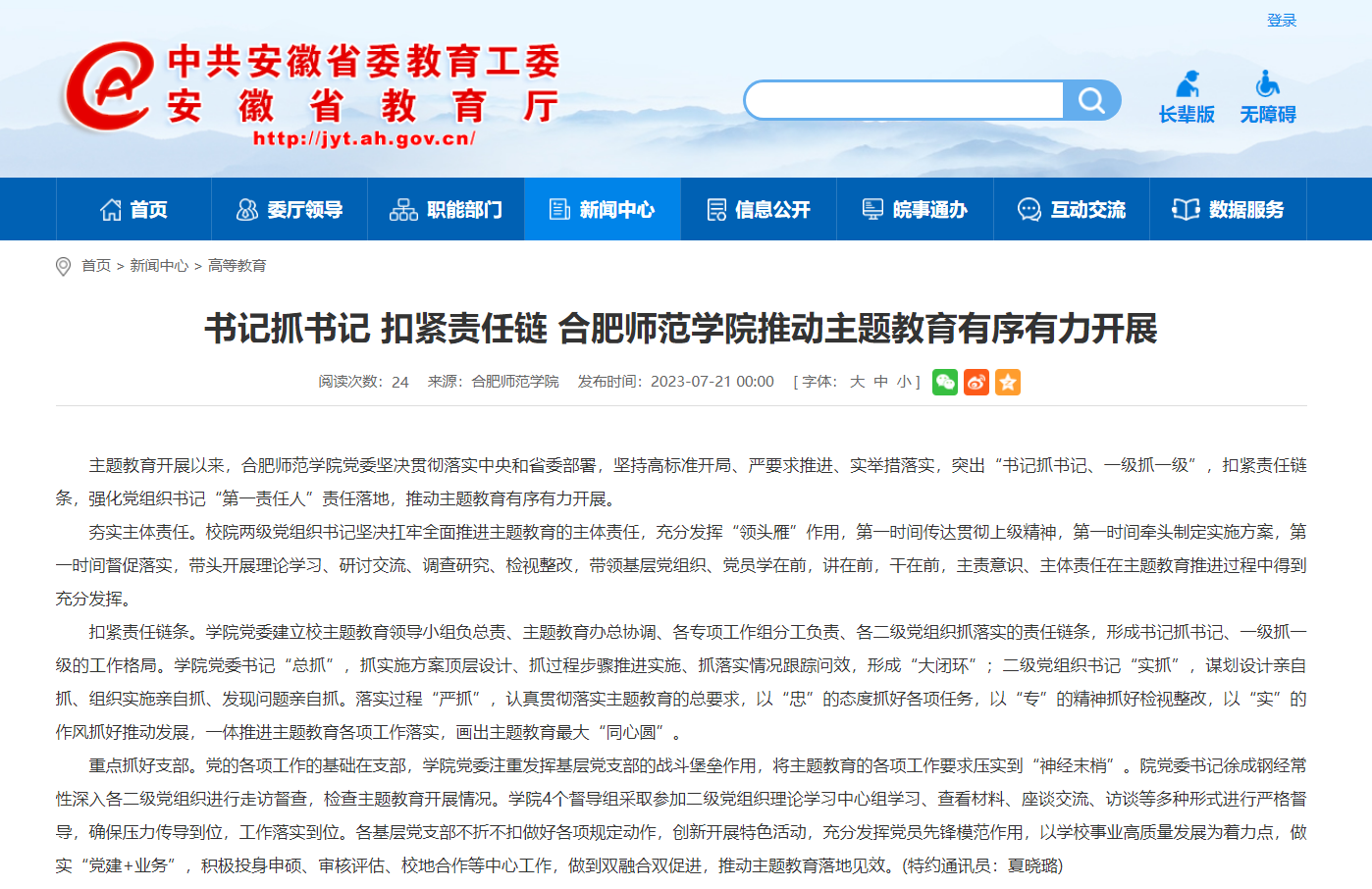 7月21日,安徽教育网以《书记抓书记 扣紧责任链 beat365在线唯一官网推动主题教育有序有力开展》为标题,对此进行了报道。