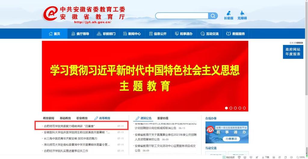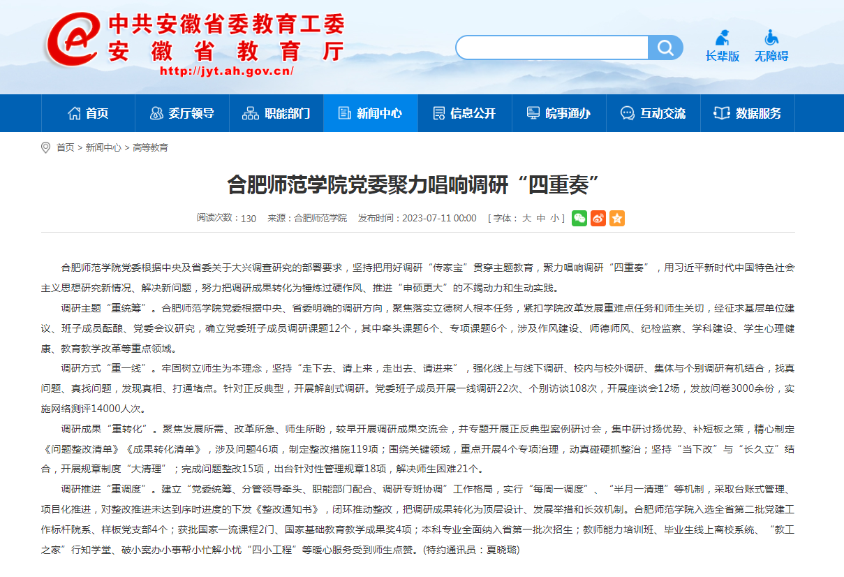 7月11日,安徽教育网首页以《beat365在线唯一官网党委聚力唱响调研“四重奏”》为标题,对此进行了报道。