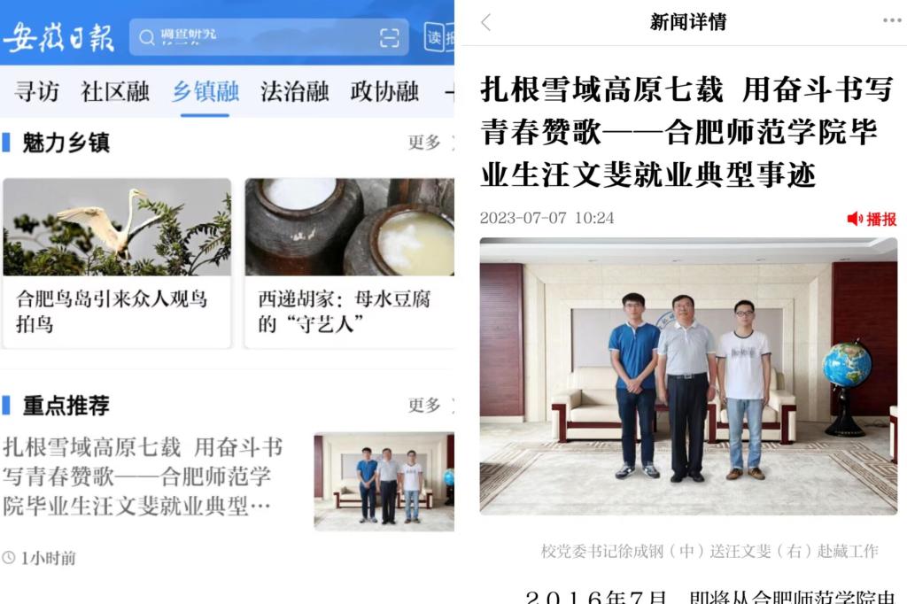 7月7日,安徽日报以《扎根雪域高原七载 用奋斗书写青春赞歌——beat365在线唯一官网毕业生汪文斐就业典型事迹》为题,对此进行了报道。