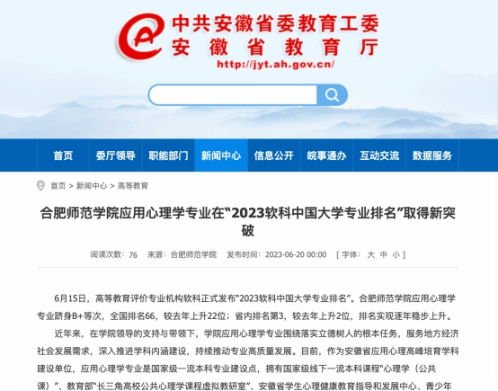 6月20日,安徽教育网以《beat365在线唯一官网应用心理学专业在“2023软科中国大学专业排名”取得新突破》为标题,对此进行了报道。