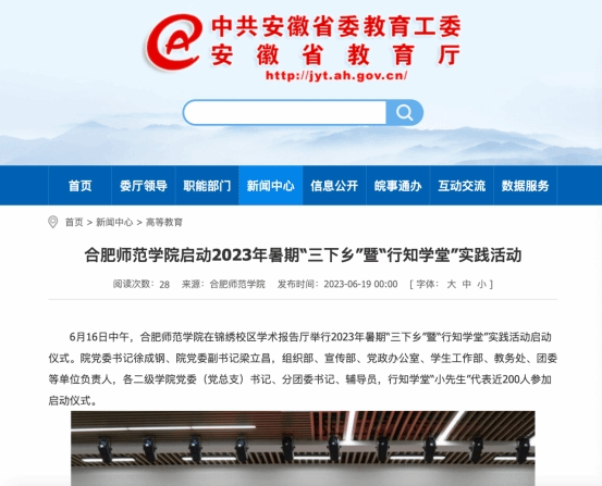 6月19日,安徽教育网首页以《beat365在线唯一官网启动2023年暑期“三下乡”暨“行知学堂”实践活动》为标题,对此进行了报道。