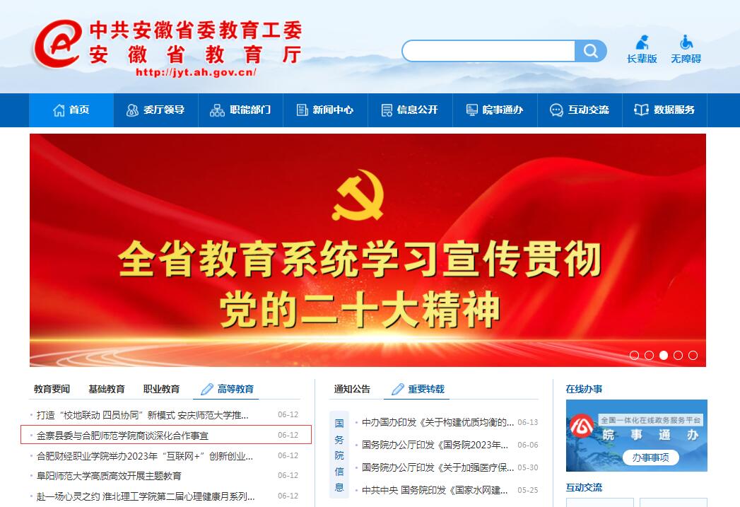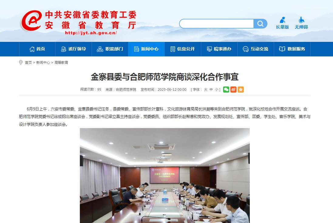 6月12日,安徽教育网首页以《金寨县委与beat365在线唯一官网商谈深化合作事宜》为标题,对此进行了报道。
