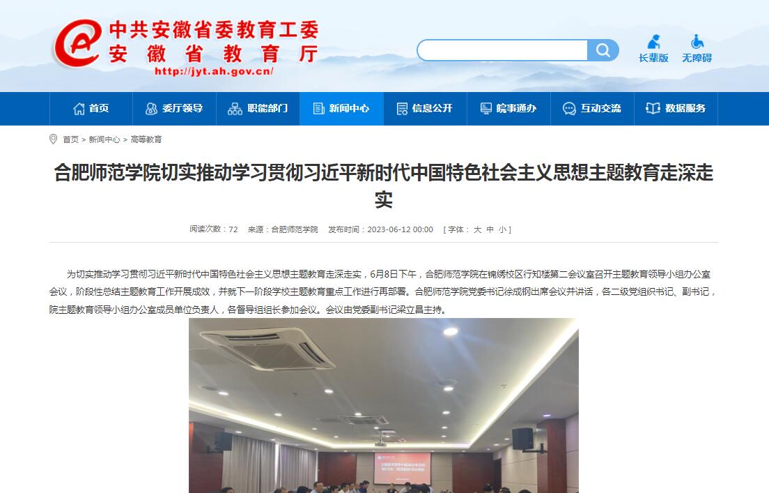 6月12日,安徽教育网以《beat365在线唯一官网切实推动学习贯彻习近平新时代中国特色社会主义思想主题教育走深走实》为标题,对此进行了报道。