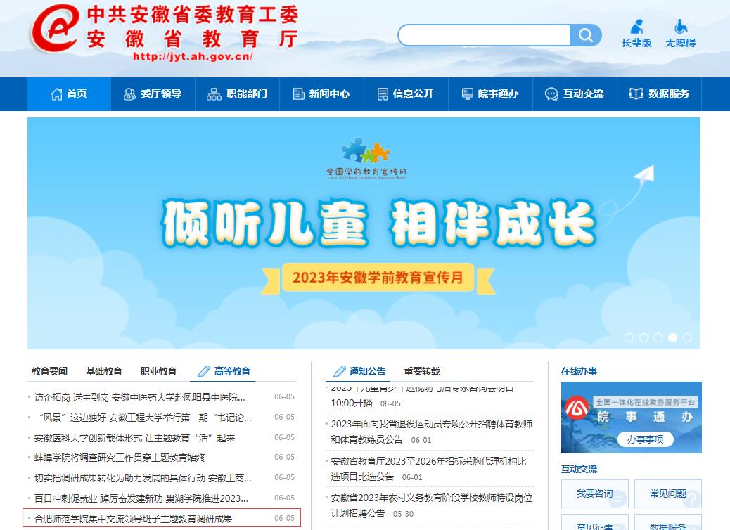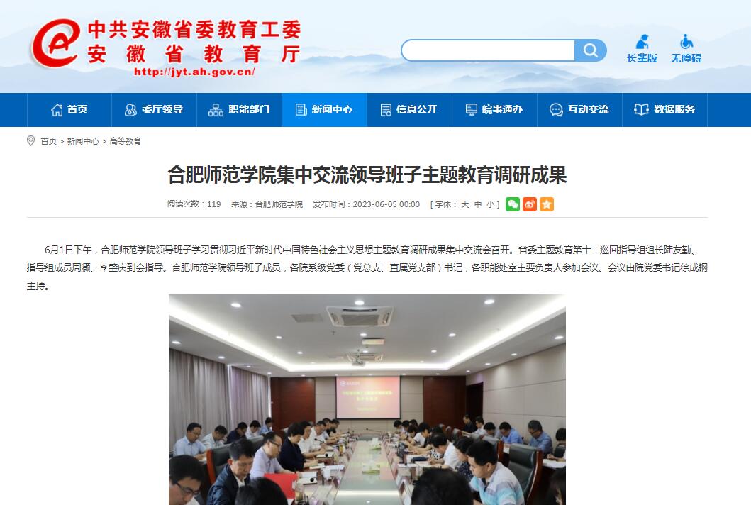 6月5日,安徽教育网首页以《beat365在线唯一官网集中交流领导班子主题教育调研成果》为标题,对此进行了报道。