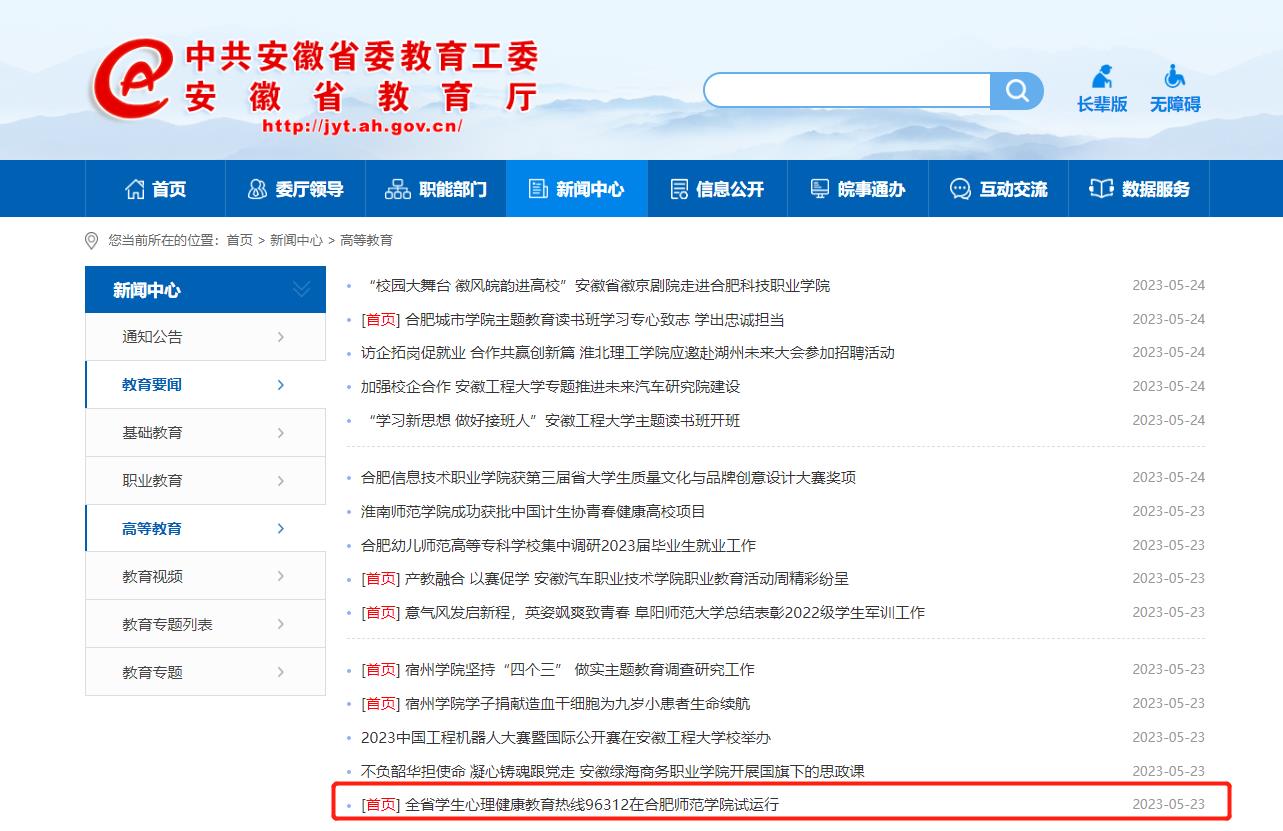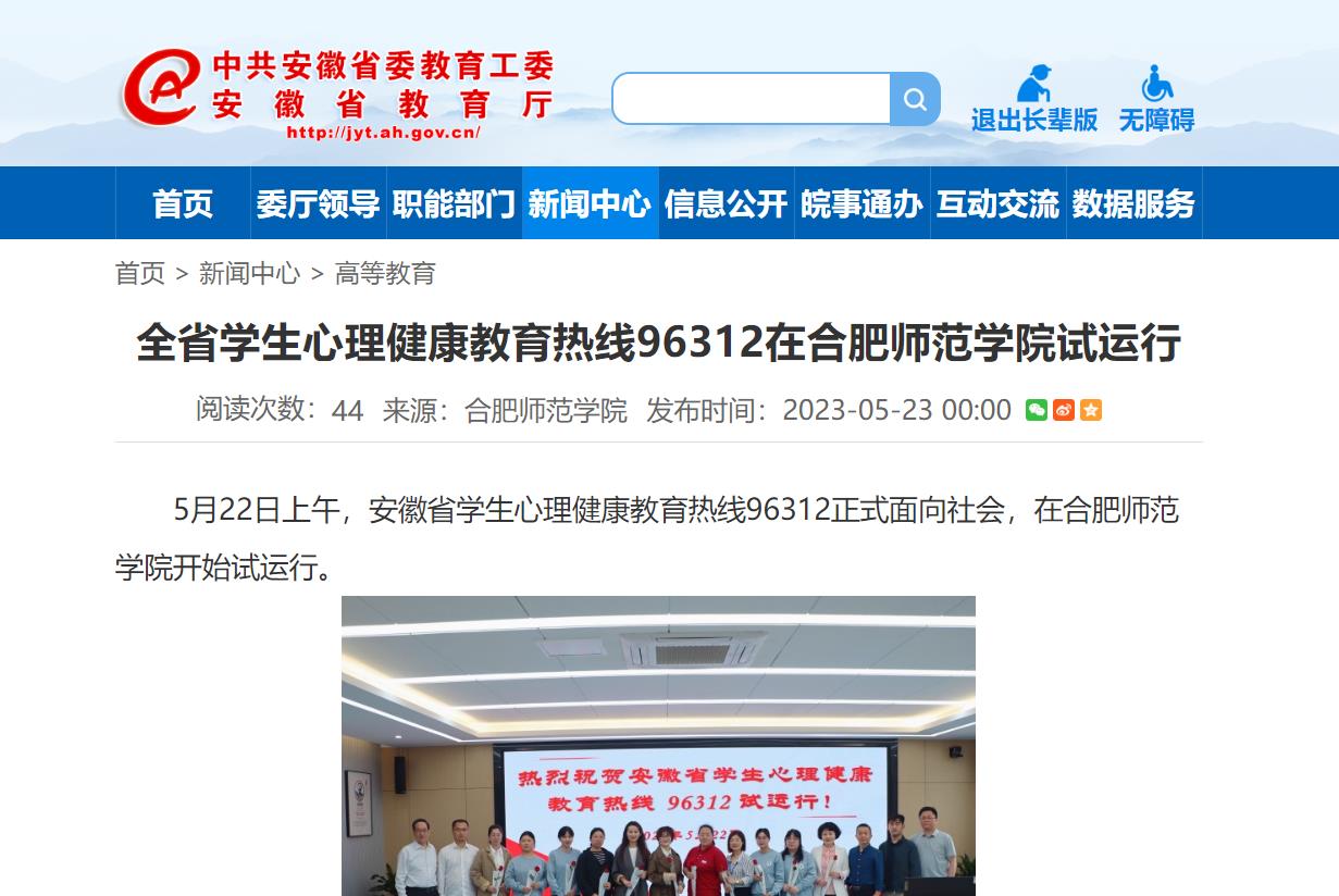 5月23日,安徽教育网首页以《全省学生心理健康教育热线96312在beat365在线唯一官网试运行》为标题,对此进行了报道。