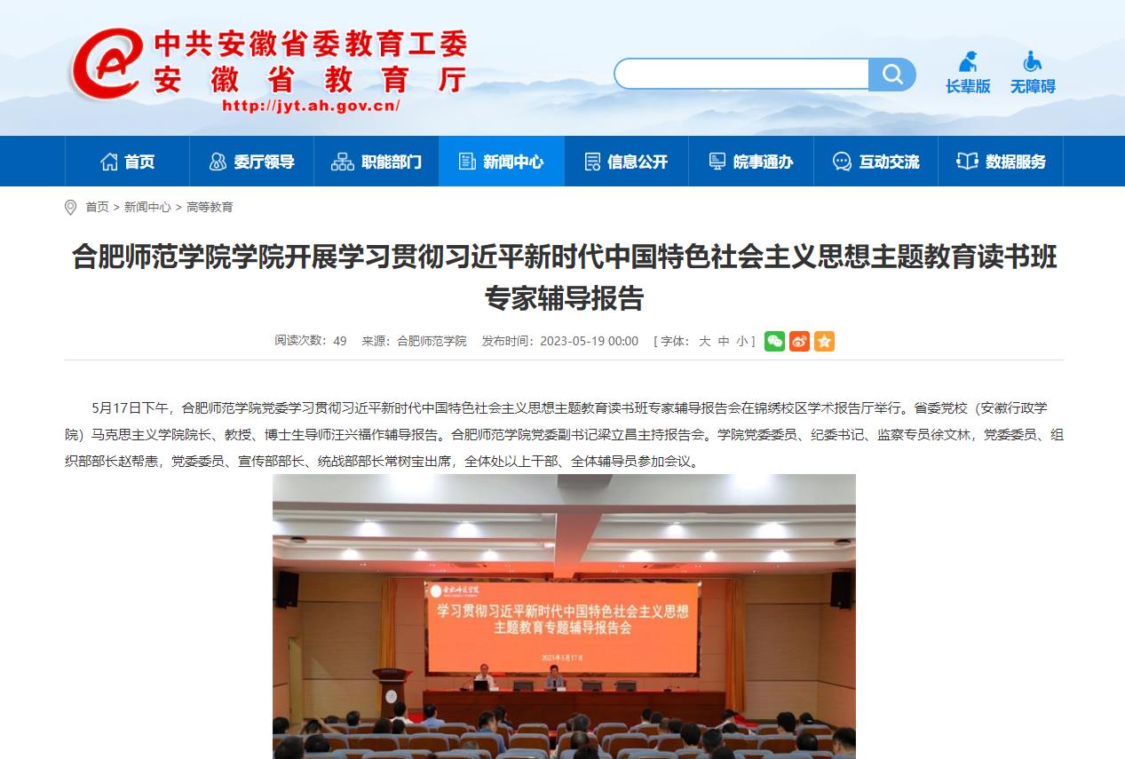 5月19日,安徽教育网以《beat365在线唯一官网学院开展学习贯彻习近平新时代中国特色社会主义思想主题教育读书班专家辅导报告》为标题,对此进行了报道。