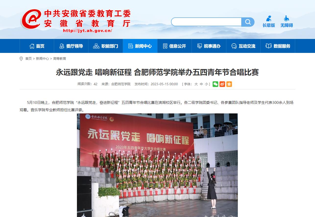 5月15日,安徽教育网以《永远跟党走 唱响新征程 beat365在线唯一官网举办五四青年节合唱比赛》为标题,对此进行了报道。