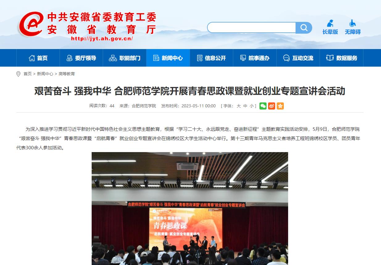 5月11日,安徽教育网以《艰苦奋斗 强我中华 beat365在线唯一官网开展青春思政课暨就业创业专题宣讲会活动》为标题,对此进行了报道。