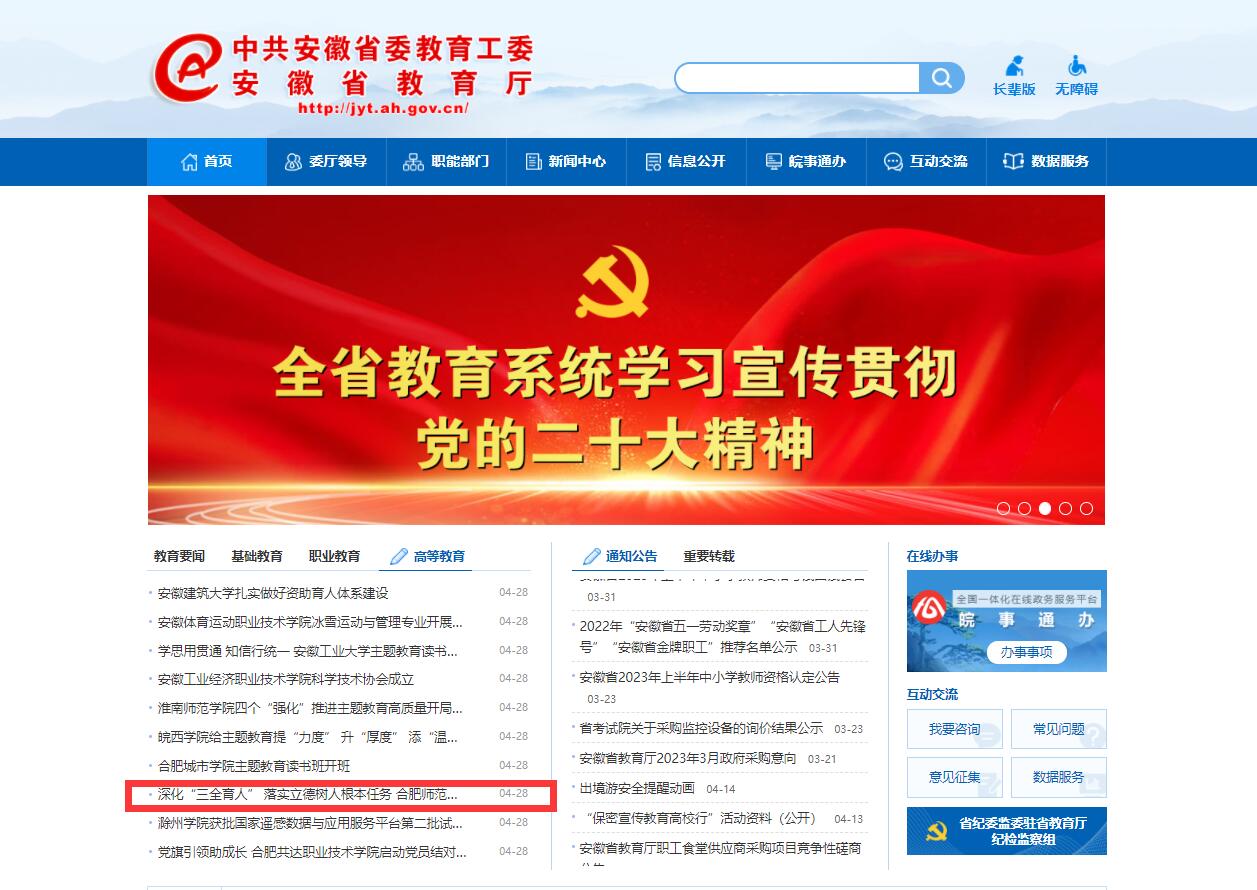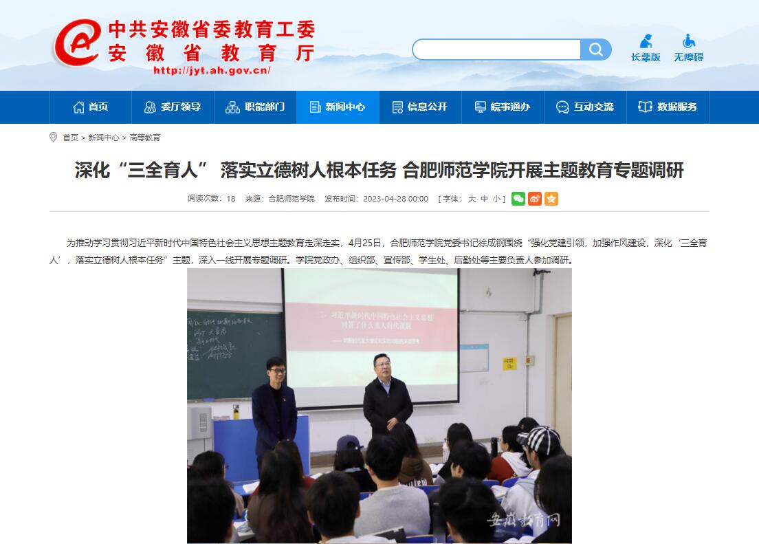 4月28日,安徽教育网首页以《深化“三全育人” 落实立德树人根本任务 beat365在线唯一官网开展主题教育专题调研》为标题,对此进行了报道。