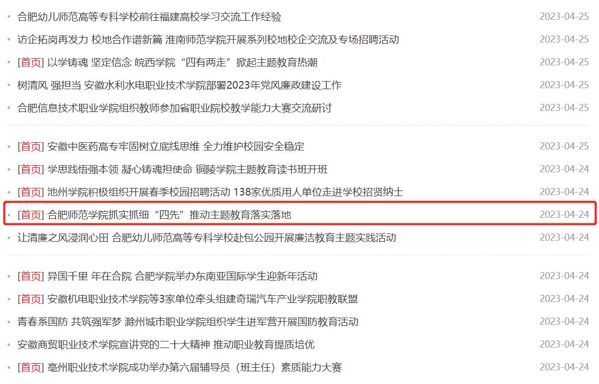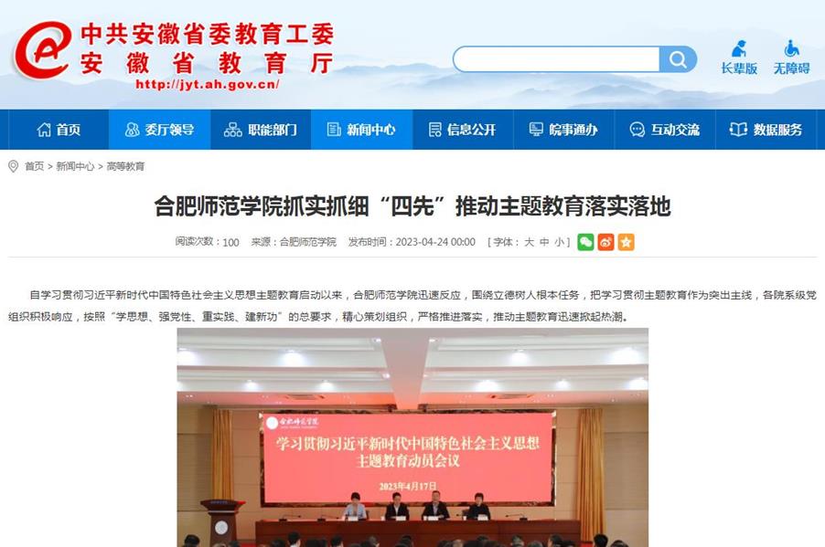 4月26日,安徽教育网首页以《beat365在线唯一官网抓实抓细“四先”推动主题教育落实落地》为标题,对此进行了报道。