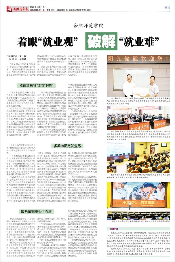 1月11日,《安徽青年报》(第2175期)以《beat365在线唯一官网:着眼“就业观”破解“就业难”》为题,用第04版通版对我院就业创业工作进行了专题深度报道。