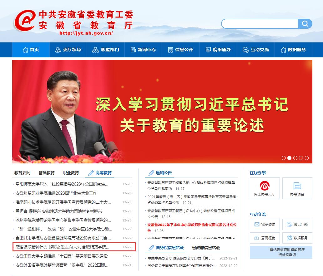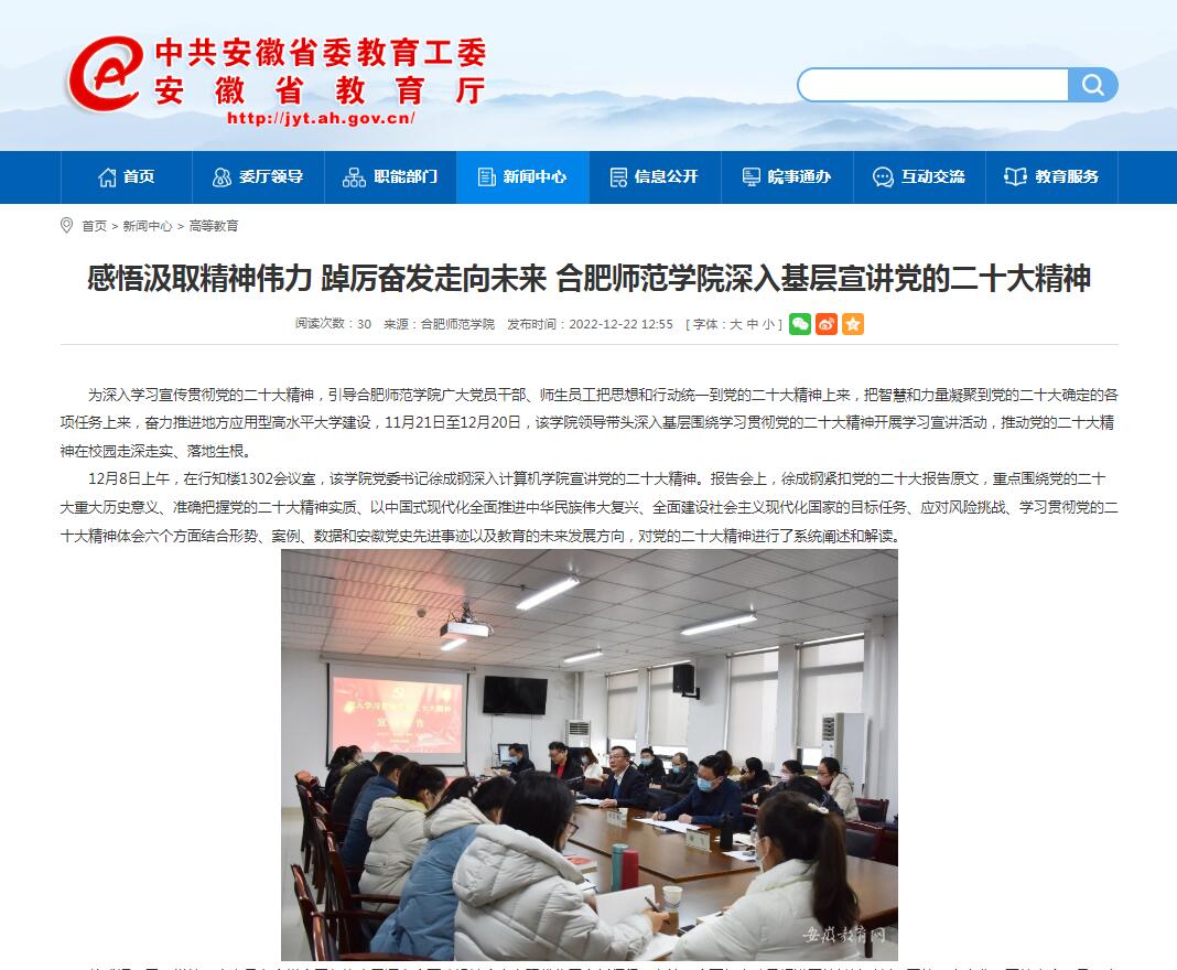 12月22日,安徽教育网首页以《感悟汲取精神伟力 踔厉奋发走向未来 beat365在线唯一官网深入基层宣讲党的二十大精神》为标题,对此进行了报道。