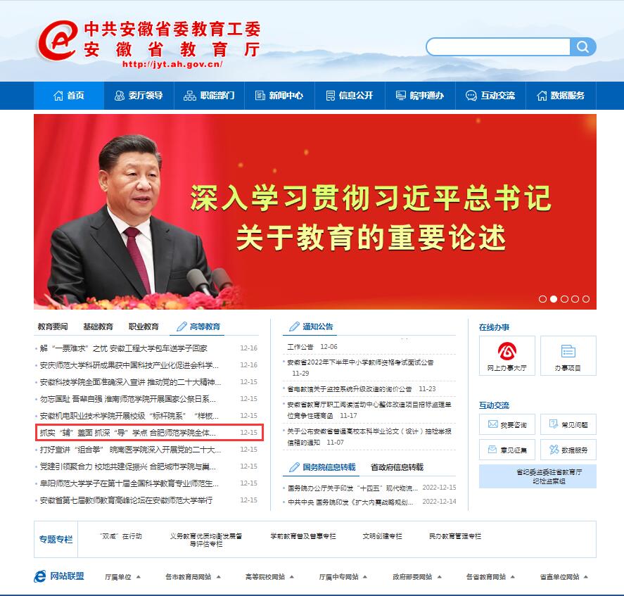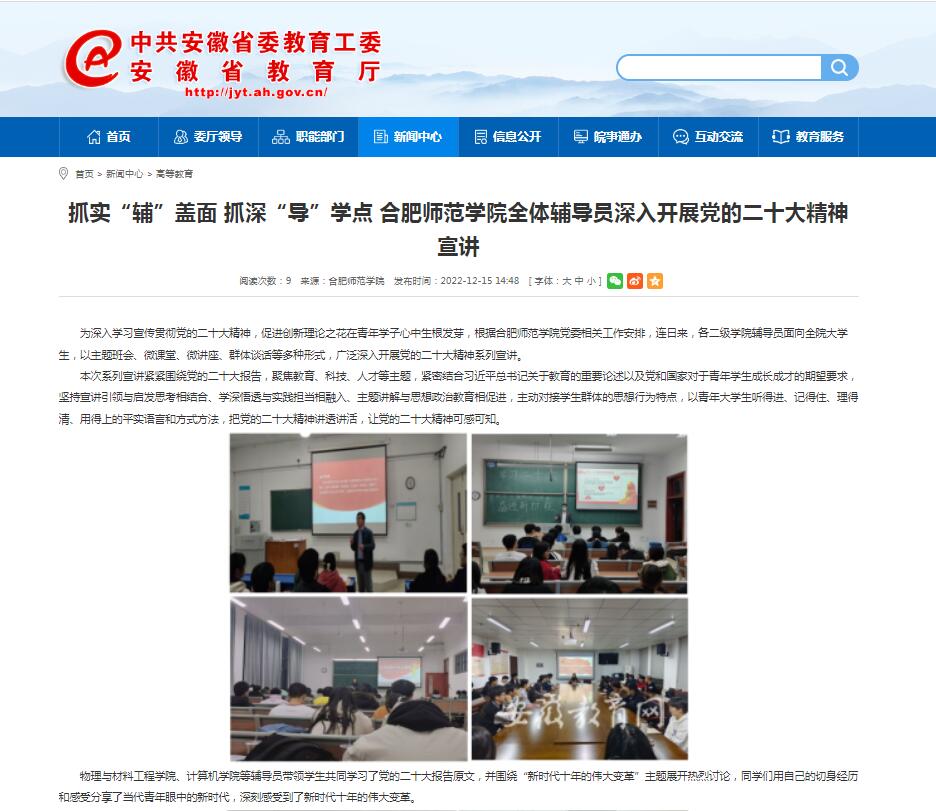 12月15日,安徽教育网首页以《抓实“辅”盖面 抓深“导”学点 beat365在线唯一官网全体辅导员深入开展党的二十大精神宣讲》为标题,对此进行了报道。