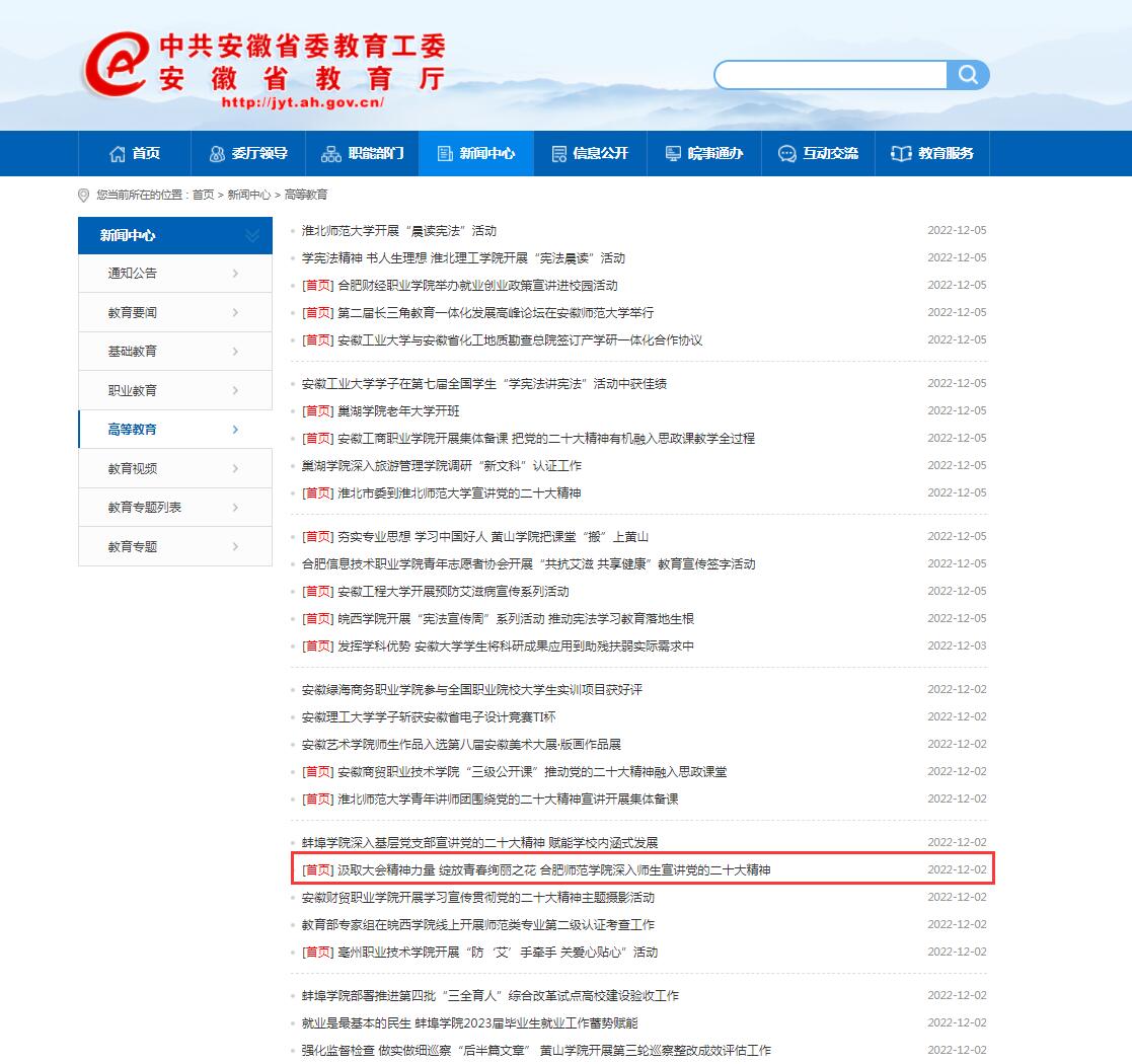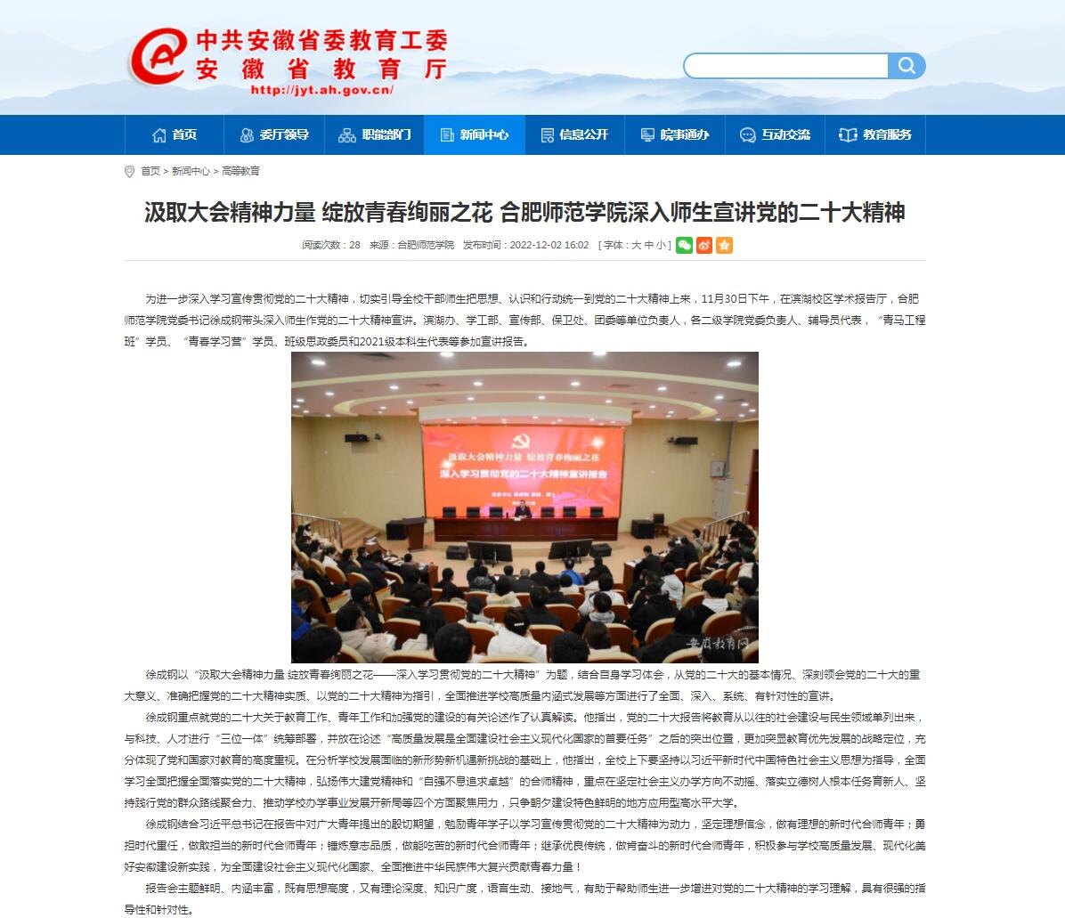 12月2日,安徽教育网首页以《汲取大会精神力量 绽放青春绚丽之花 beat365在线唯一官网深入师生宣讲党的二十大精神》为标题,对此进行了报道。