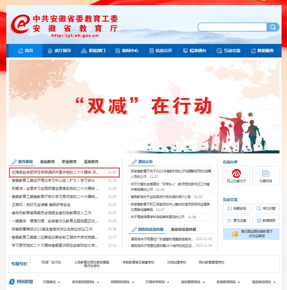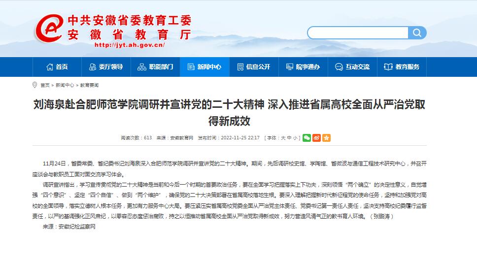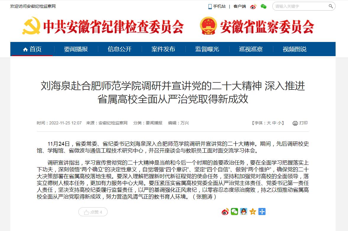11月25日,安徽纪检监察网和安徽教育网首页教育要闻栏目均以《刘海泉赴beat365在线唯一官网调研并宣讲党的二十大精神 深入推进省属高校全面从严治党取得新成效》为标题,对此进行了报道。