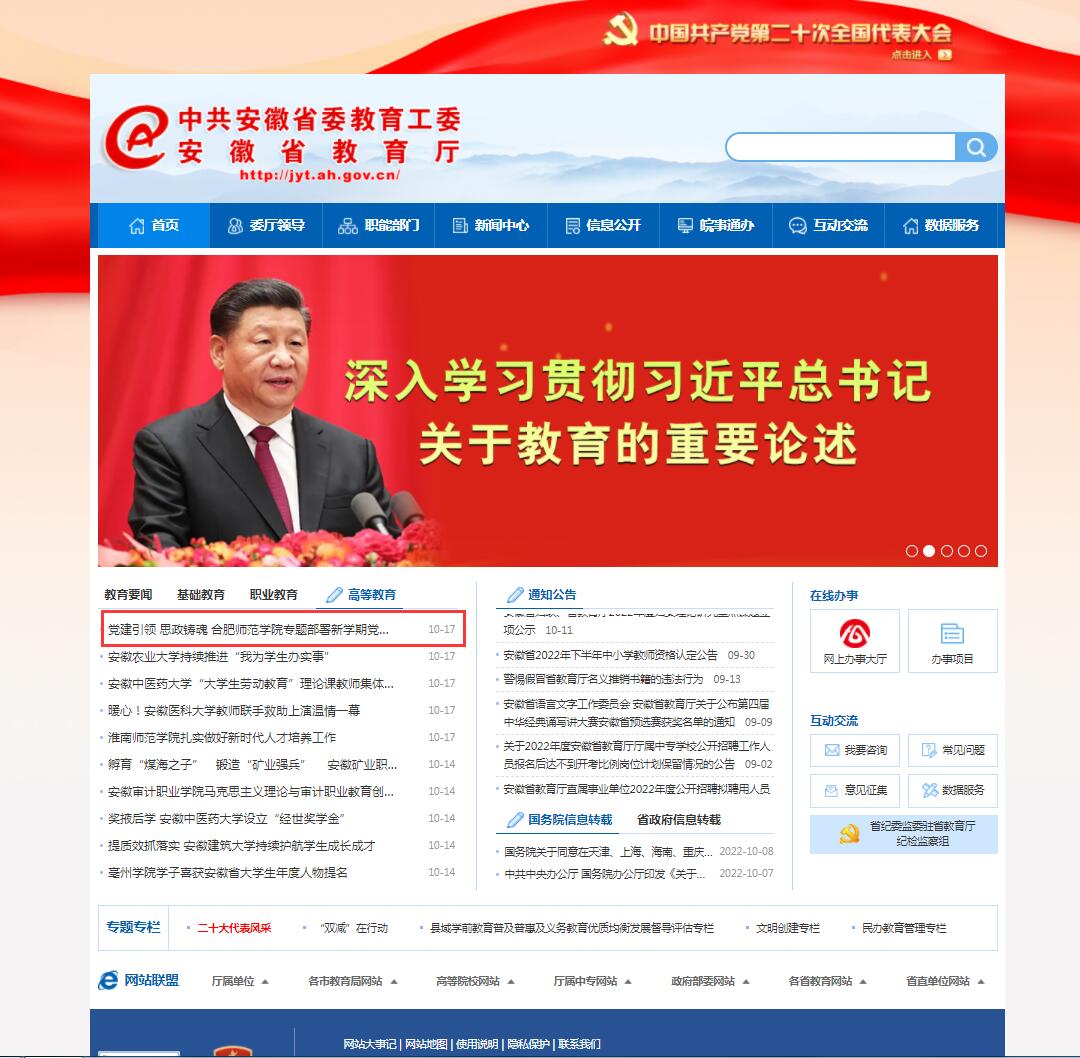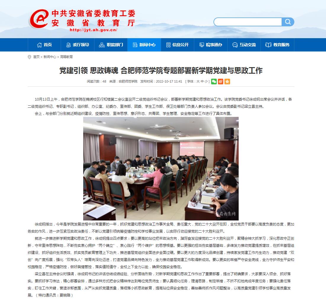 10月17日,安徽教育网首页以《党建引领 思政铸魂 beat365在线唯一官网专题部署新学期党建与思政工作》为标题进行了报道。
